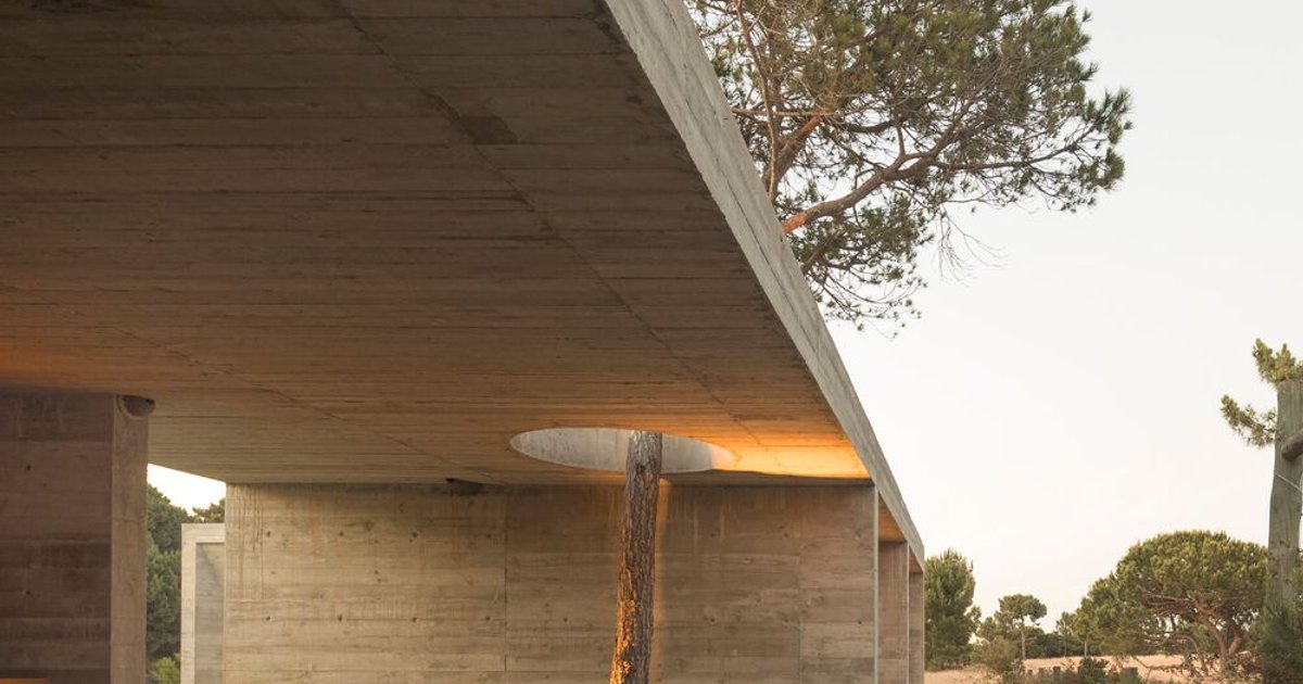 On the sandy littoral plain south of Lisbon, where maritime pines lean into the Atlantic wind and dry grasses turn gold by midsummer, DNSJ.arq has placed a house that refuses to compete with its setting. Meco's House is organized as three low, board-formed concrete volumes arranged around a central courtyard, each one calibrated to frame a specific relationship with the ground, the sky, and the trees already on site. The result is a project that reads as landscape infrastructure as much as dwelling: heavy enough to anchor itself against the wind, porous enough to let the terrain flow through it.