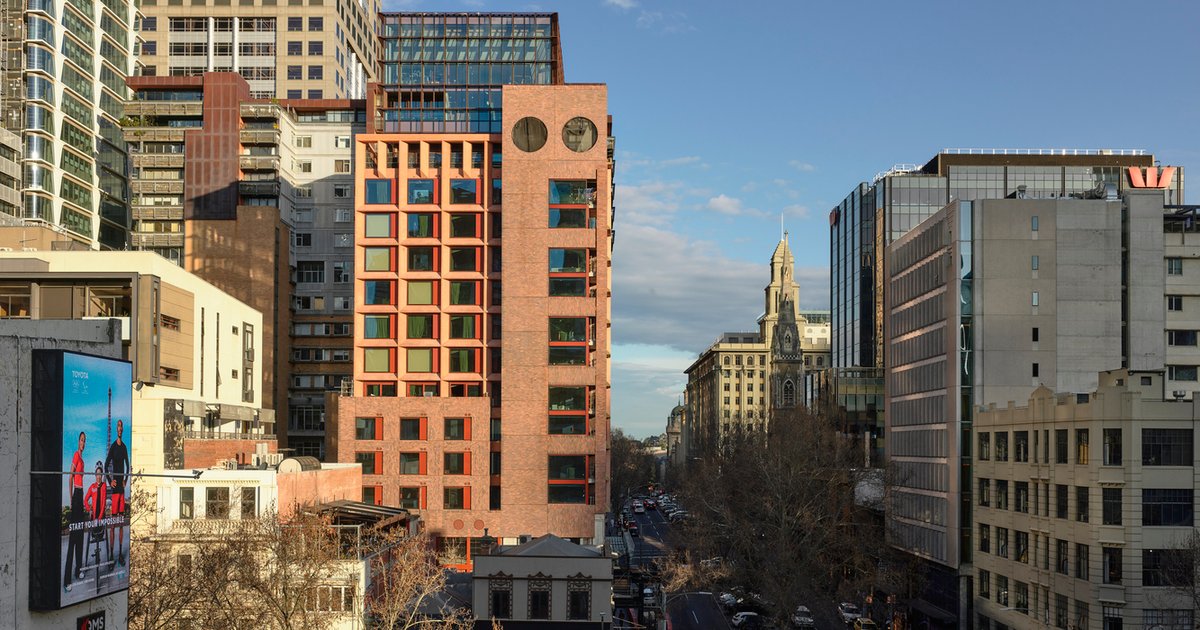 Spanning 16 levels with two basement floors, Melbourne Place features a double-height ground plane, a projecting first-floor balcony over Russell Street, and a three-level recessed “top-knot” framed by a delicate corten steel brise-soleil. The building incorporates an abstract zoomorphic form, giving it a distinctive personality with a long brick “neck” and super-scaled “eyes,” which imbue the structure with warmth and familiarity.