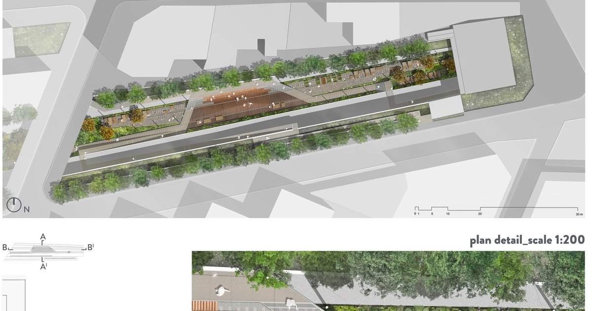 The integration of greenery within the linear trench softens the urban condition, creating a microclimate that contrasts with the surrounding city. Elevated walkways, stepped seating, and planted zones contribute to a multi-level experience that encourages exploration and pause.