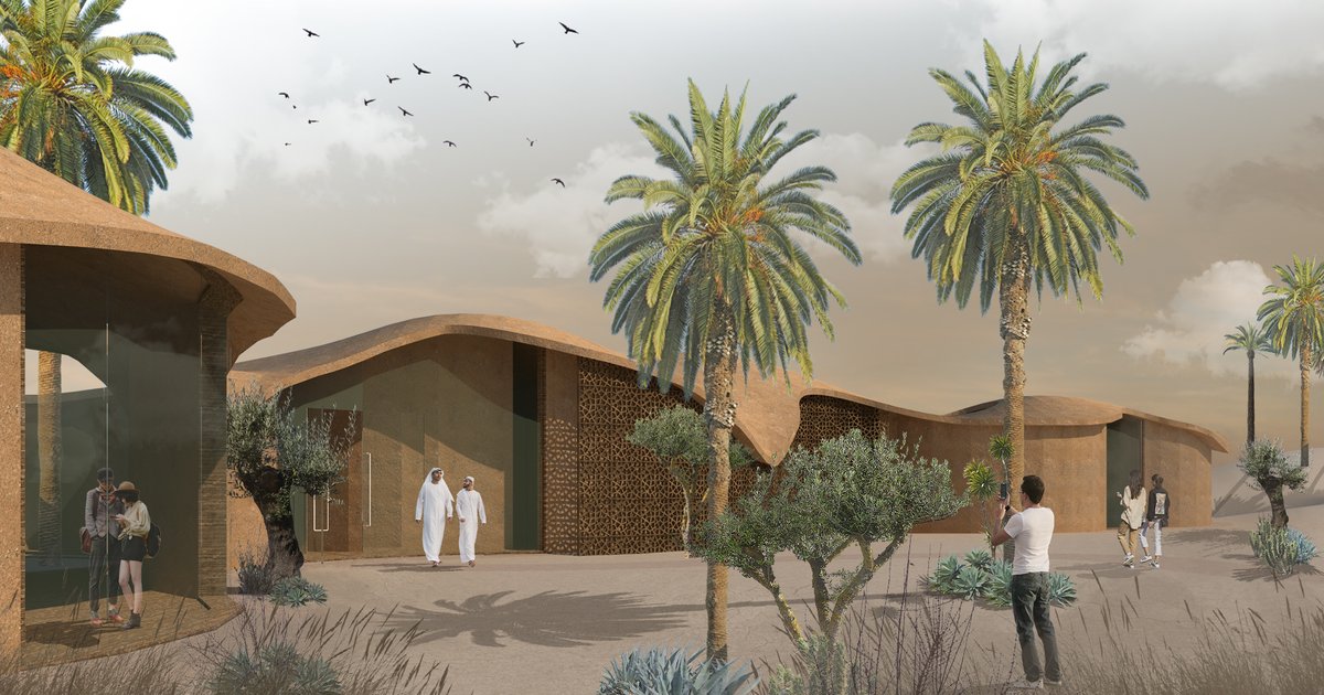 Then came the vision, initial concepts, and the idea itself. The designed facility is located in a sandy place by the water. The inspiration was sand and dunes, which change their shape under the influence of wind. Oval forms and projections showing the solids that form a body of natural movement, which naturally migrates as it moves further. The roof, which in its form also refers to the desert, stands out not only from the human perspective, but also from the bird's eye view. The hills on the roof, as well as the smooth descents, refer to the dunes and flowing sand. The colors of the materials also play an important role, as they emphasize the place where the object is located. The atriums located in the building refer to Moroccan architecture. their purpose is to illuminate the designed rooms and refer to the local culture. The visual element accentuating the structural elements are additional openwork, closely related to Moroccan mosaics. The shadow they create, constantly changing in the rhythm of the sun, alludes to the movement of the sand carried by the wind on the desert dune. The interior is shared into three spaces, so it is simple and clear. A division was created into a part that is periodically visited, such as a theater or art gallery, an office part, as well as a customary part, which includes gastronomy and the sale of workshops. The utility rooms were properly lit and located in a way that opens up to the surrounding landscape. The entire facility includes ecological solutions and solutions that will make the building self-sufficient in terms of energy. It will also become a place adapted to stay in high temperatures. An inseparable, important element of the whole project is the vegetation complementing the buildings in the form of Oxytree trees, the use of which plays an important role in the project.