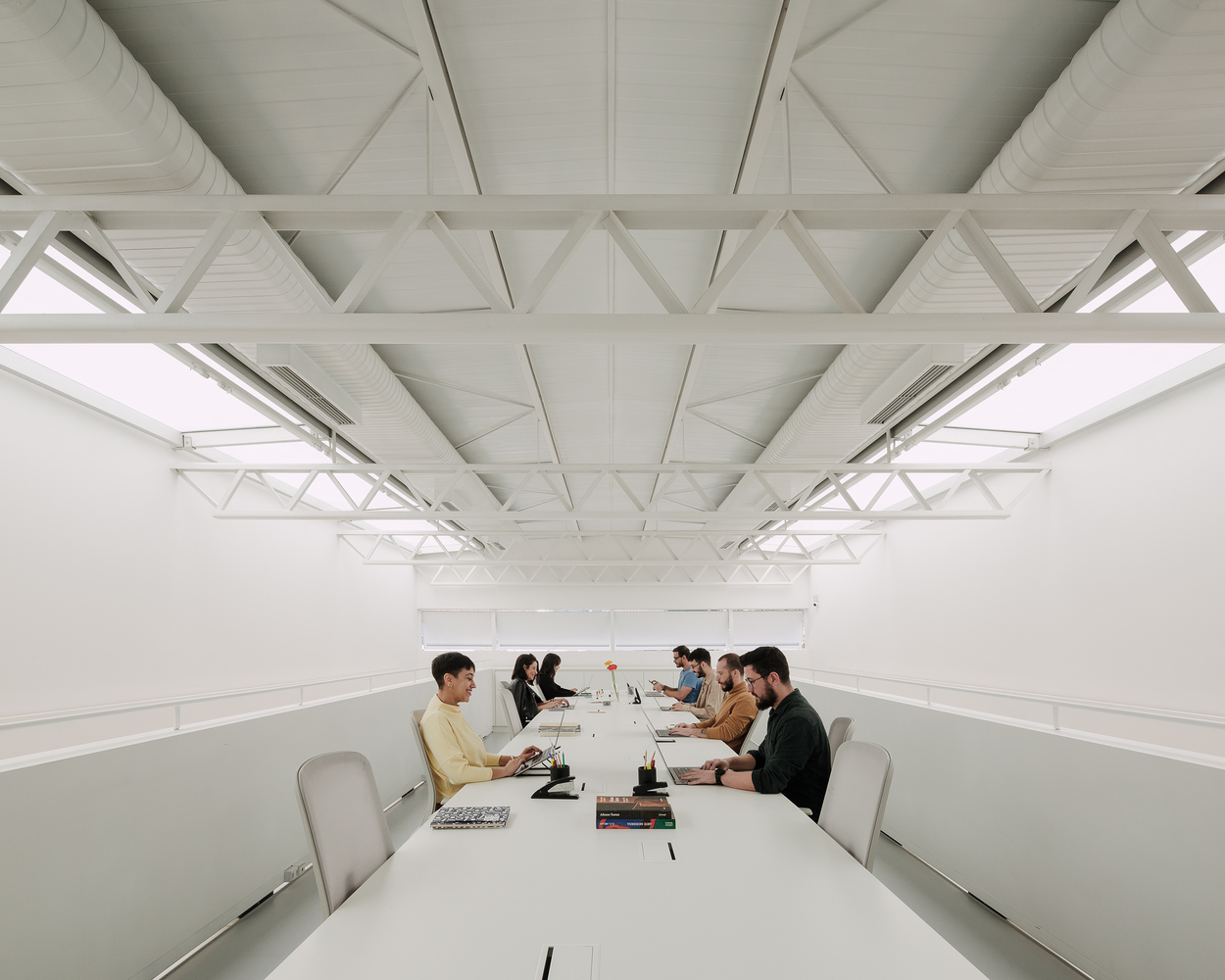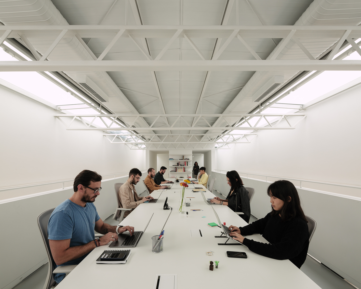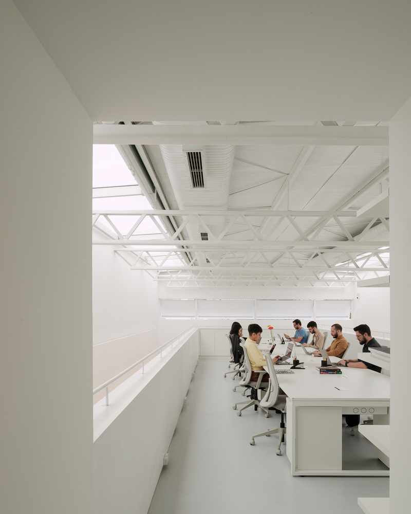 The exhibition hall is situated on the ground level, where the spatial clarity is enhanced by a central double-height volume. Hovering above is a mezzanine that houses office functions. Ingeniously, the mezzanine is designed as a suspended steel platform that avoids contact with the sidewalls, thus preserving the volumetric purity of the space and allowing daylight to penetrate deep into the gallery.