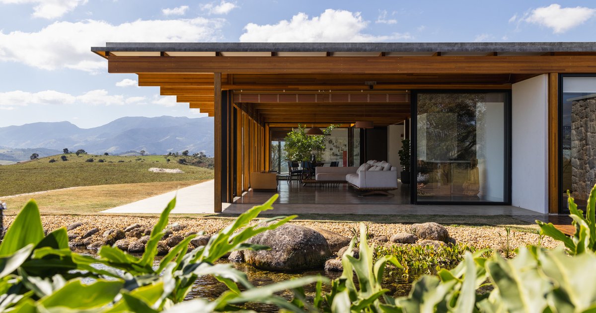 Minas House by Sabella Arquitetura blends modern design with Minas Gerais landscapes, featuring delta-wing layout, panoramic views, modular structure, natural materials, and an internal garden.