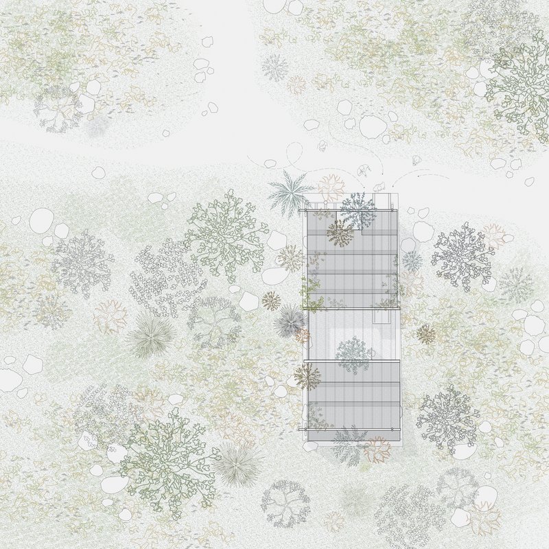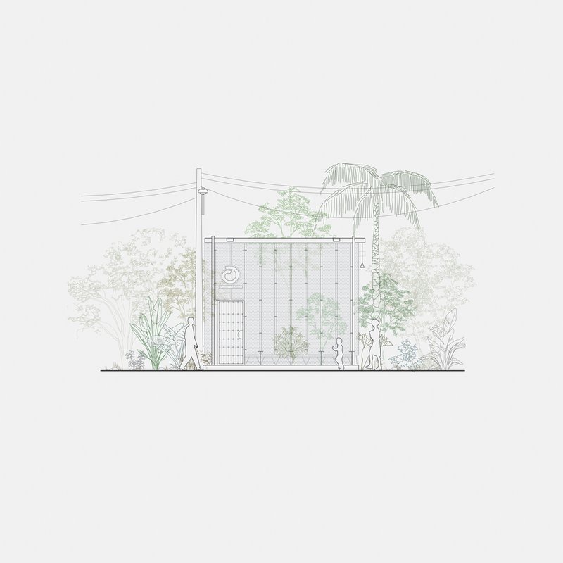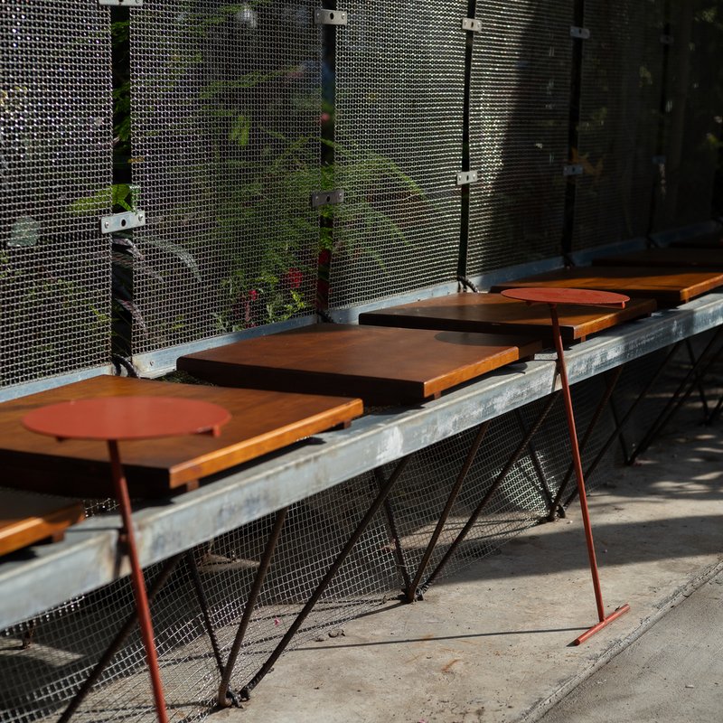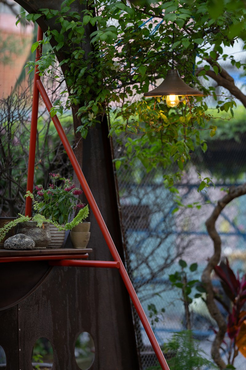 The partitions are constructed from 3mm weathered steel sheets, bent along the edges for both structural reinforcement and aesthetic softness. These handmade elements evoke the texture and tone of aged timber, grounding the space in tactile familiarity while remaining contemporary. The façade, composed of steel mesh, lightens the visual weight of the building and allows for unobstructed interactions between interior and garden.
