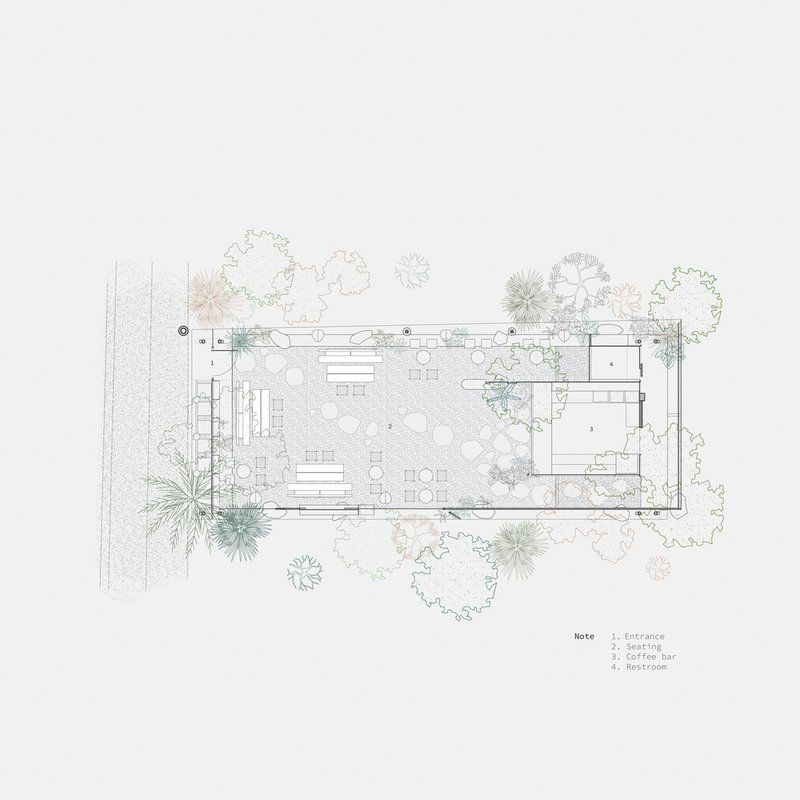 Partitions and enclosures are reduced to implied elements. Openings, courtyards, and changes in material cue visitors to understand zones without physical separations. A sense of privacy is maintained through spatial gestures rather than walls, reinforcing the garden’s presence in every corner of the café.