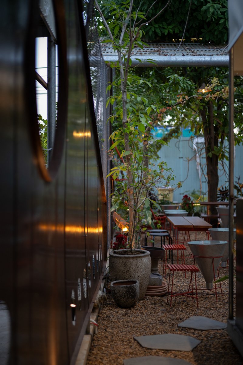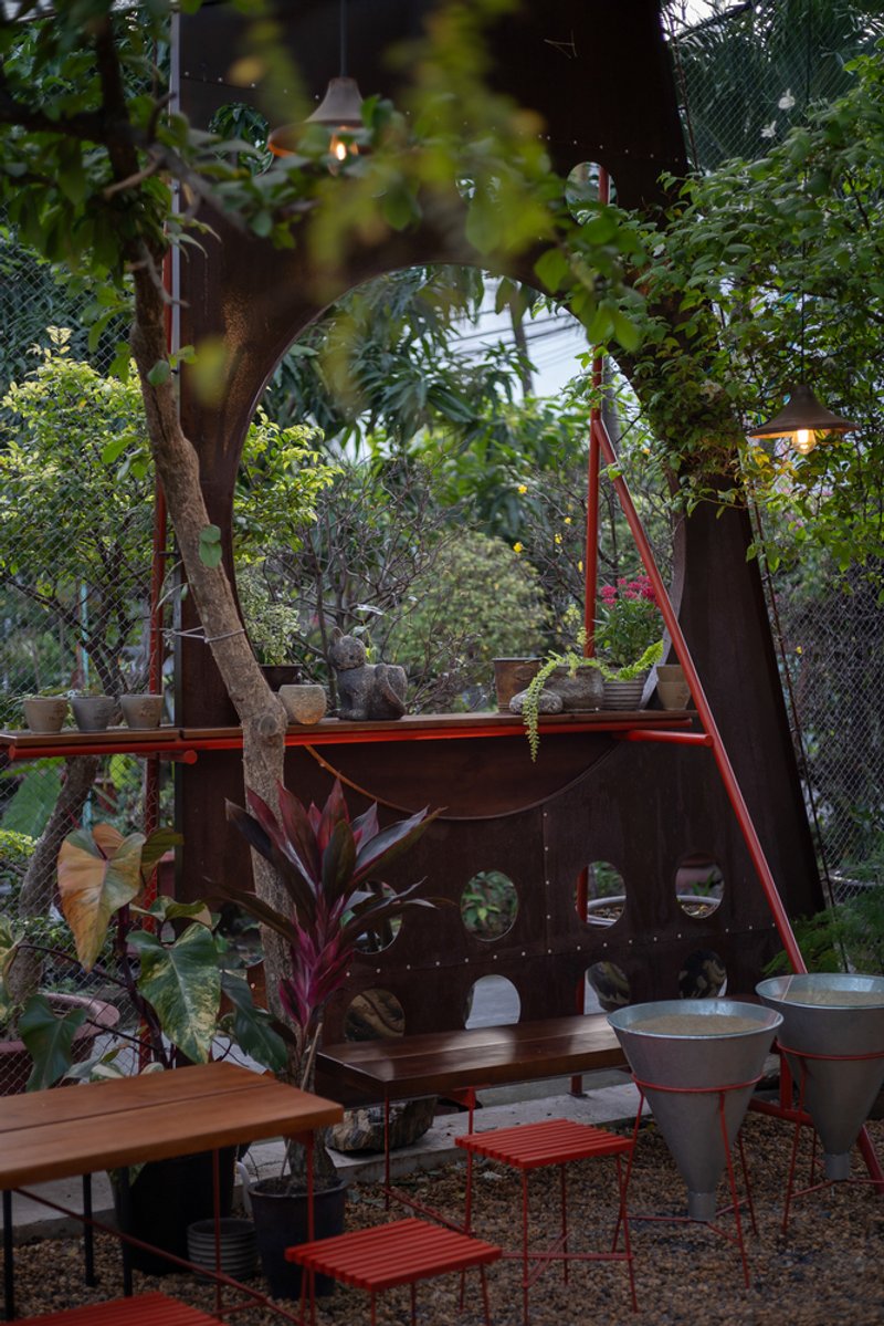 The café’s program seamlessly coexists with the existing garden, blurring the boundaries between domesticity and public space. The garden, once private, now serves both the house and the café in a shared capacity. This dual function creates a spatial fluidity where greenery acts not as decoration but as an active agent in the design.