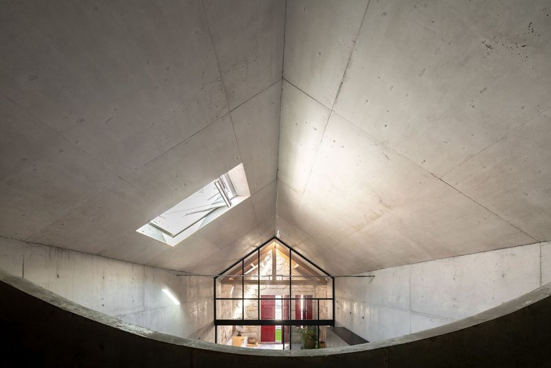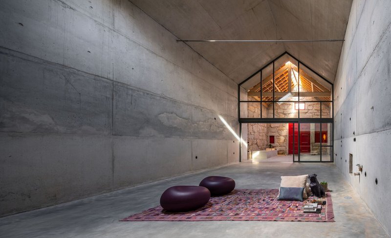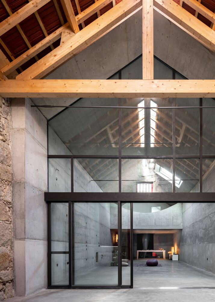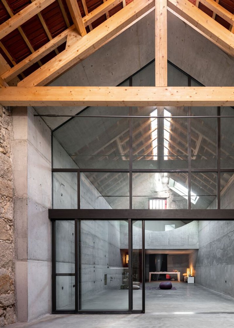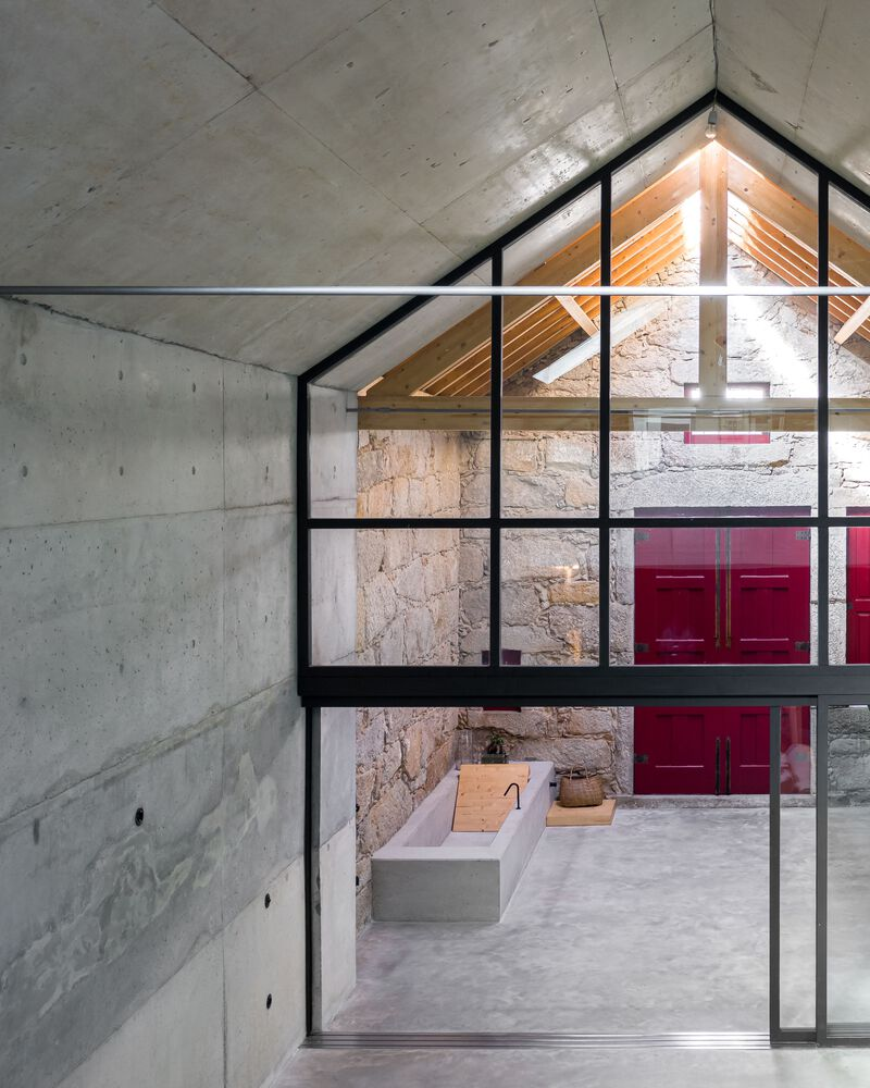 One of the defining elements of MIRAFLOR’s design is the way the new interior volume is placed within the warehouse without touching the original exterior facades. This strategy preserves the authenticity of the pre-existing structure while generating transitional spaces that blur the boundaries between history and modernity. The new volume appears to float, emphasizing the contrast between the aged granite stone walls and the contemporary concrete additions.