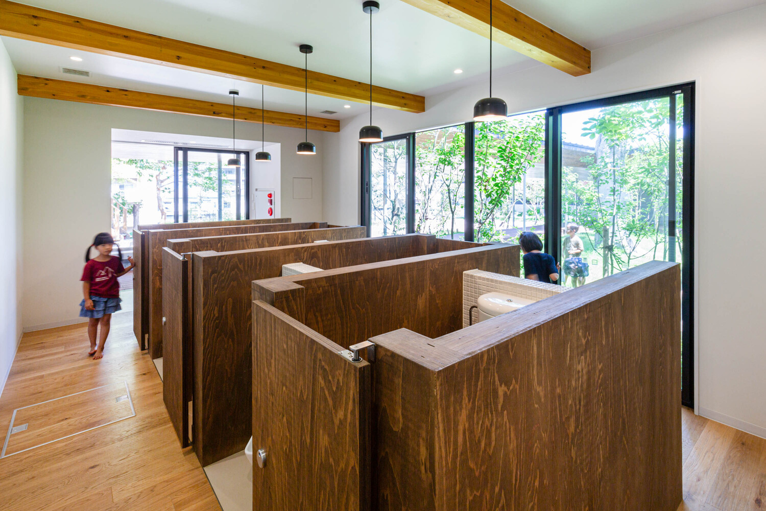 The external corridor, reminiscent of the traditional Japanese veranda, connects the playground with the classrooms. This semi-outdoor space allows children to experience natural phenomena such as rain and wind, refining their senses and nurturing self-awareness. The architecture encourages children to observe seasonal changes and understand the dynamic relationship between themselves and the environment.