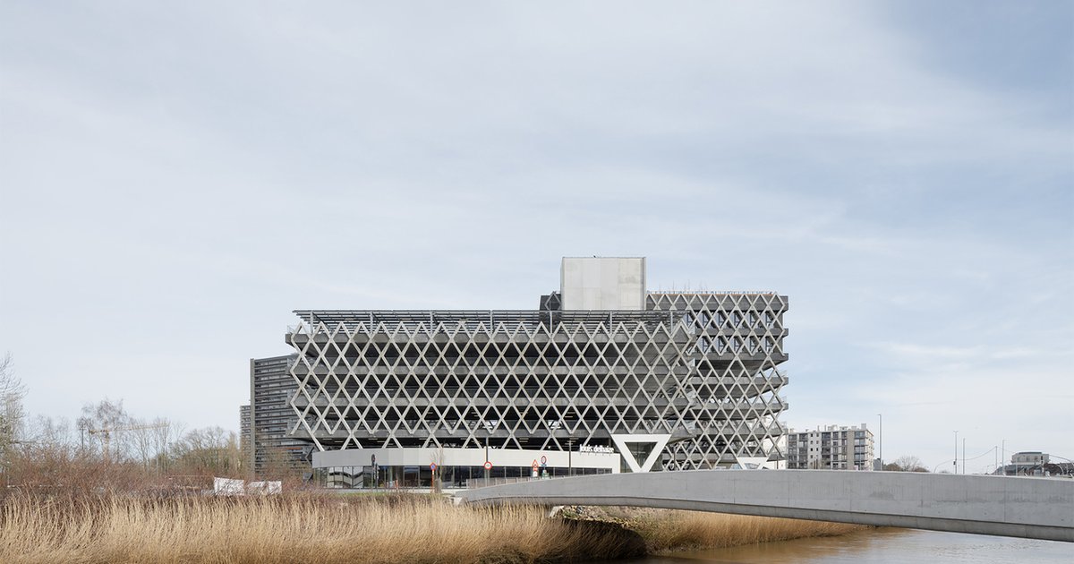 A sustainable mobility hub in Mechelen integrating parking, offices, retail, and public terraces, promoting shared transport and urban transition.