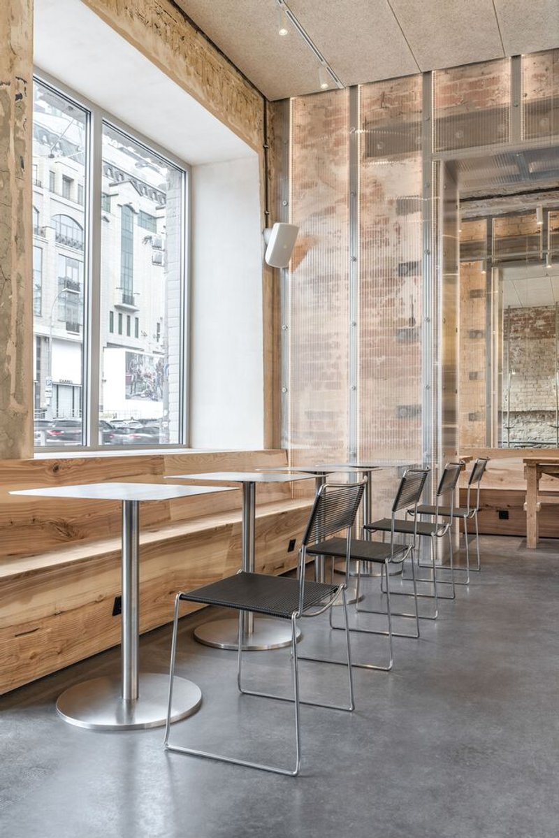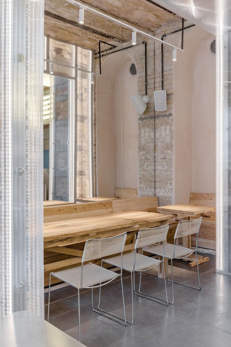 Moch Restaurant in Kyiv features a compact 55 m² design, blending warm wood, exposed brick, stainless steel, and innovative polycarbonate lighting.