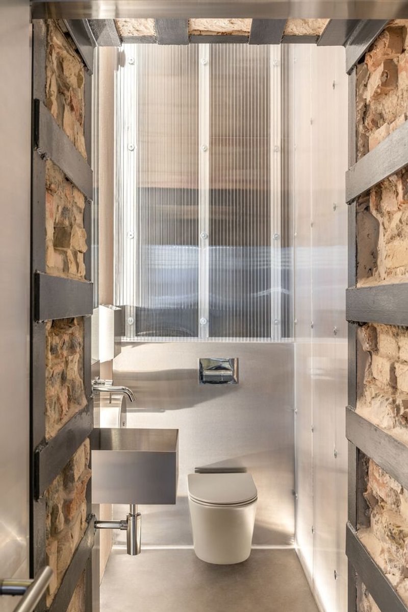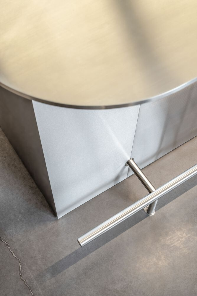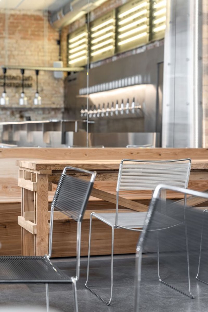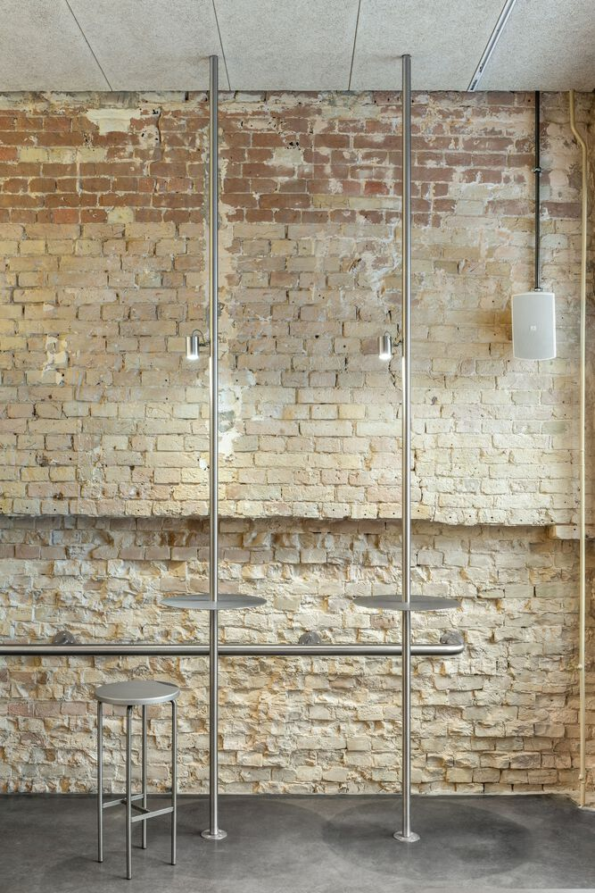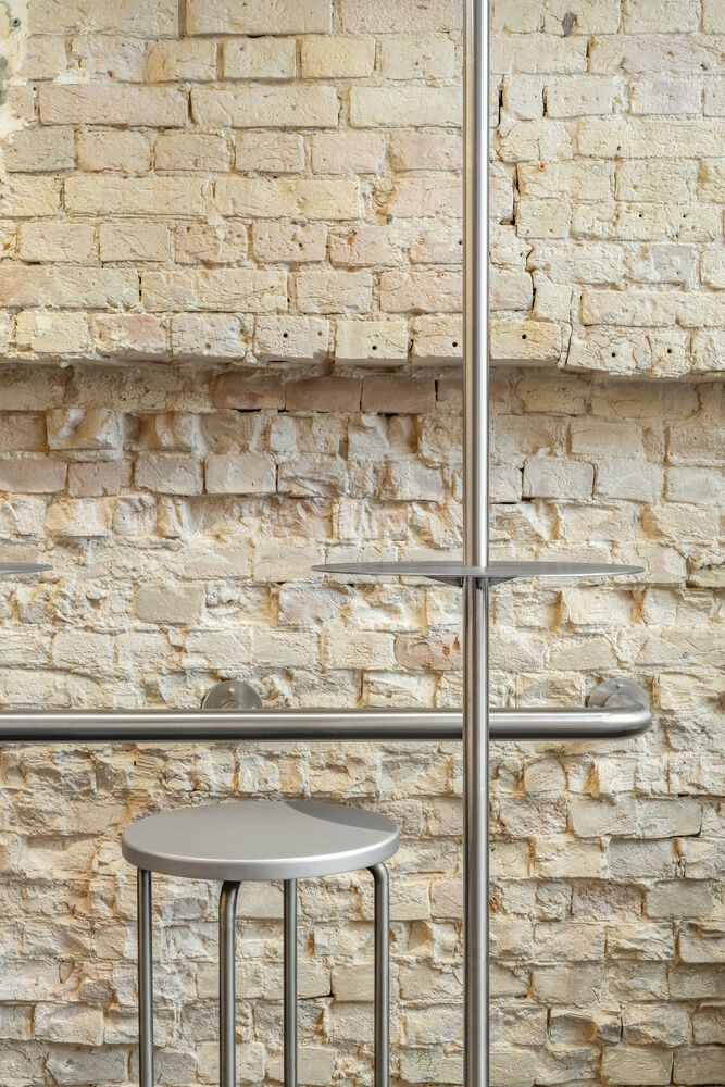 The restaurant’s material palette combines functionality with warmth. Sleek stainless steel surfaces define the kitchen and bar, highlighting modern industrial influences. In contrast, the dining area incorporates natural wood accents, creating a warm and inviting atmosphere. Exposed brick walls provide textural depth and urban character, while strategically placed mirrors expand the sense of space and reflect natural light, enhancing the overall ambiance.