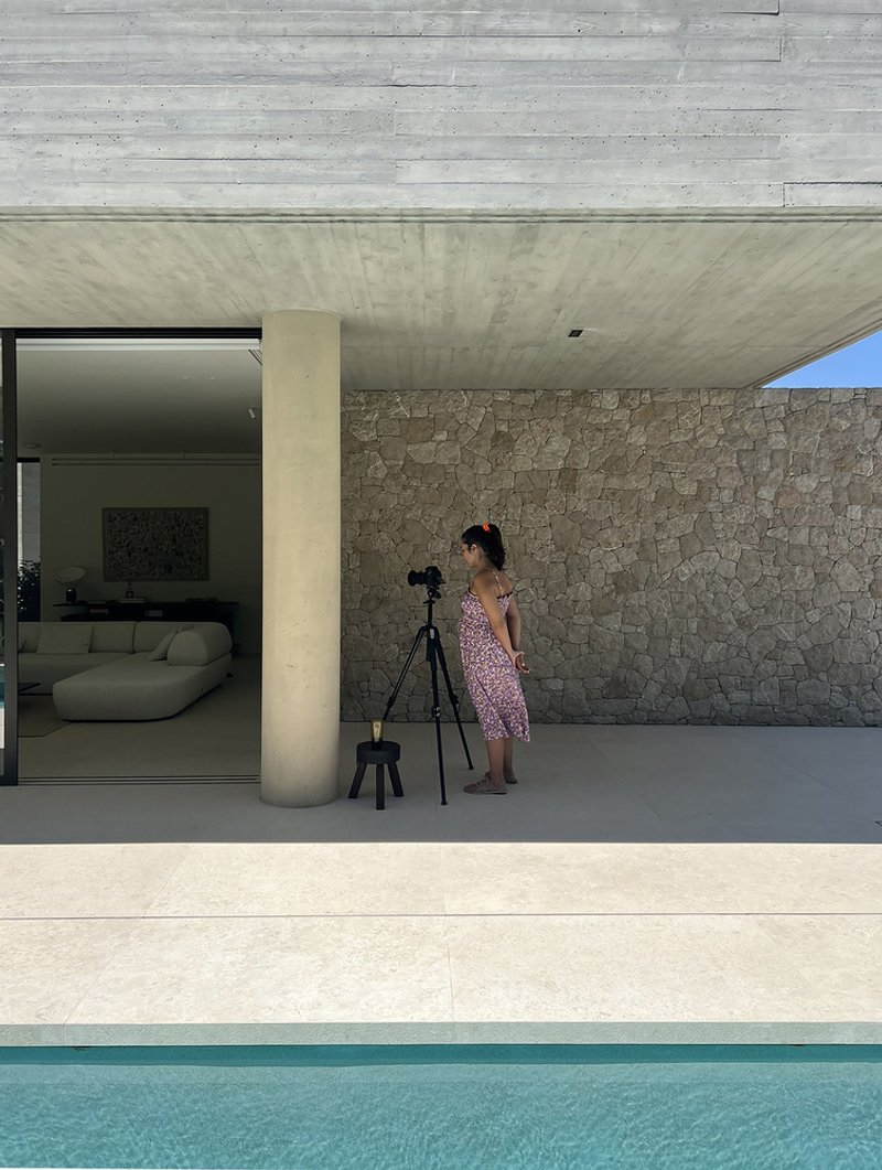 The primary structure, a suspended monolithic volume of exposed concrete, reflects the residence’s foundational concept. The choice of concrete not only emphasizes the solidity and security associated with caves but also adds a timeless aesthetic to the building.