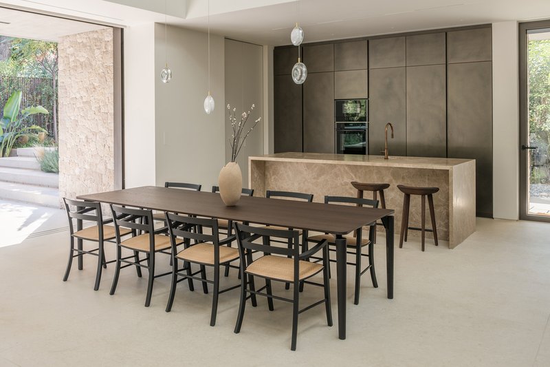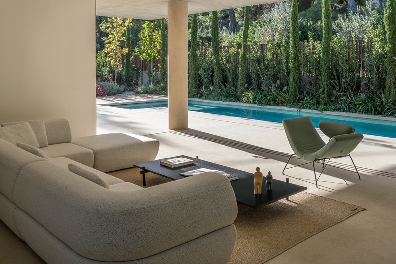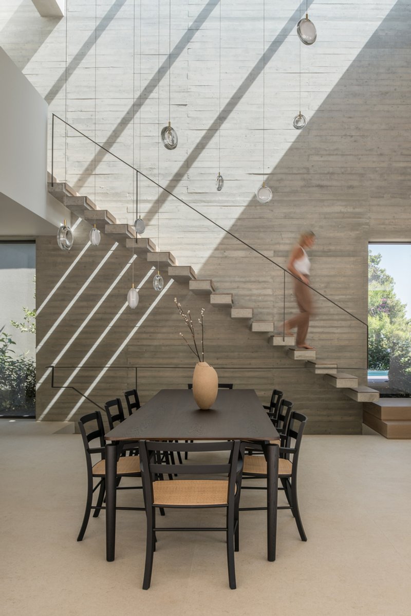 The strategic orientation and material choice contribute to the home’s energy efficiency, with natural light reducing the need for artificial lighting and the thermal mass of concrete moderating the interior climate.