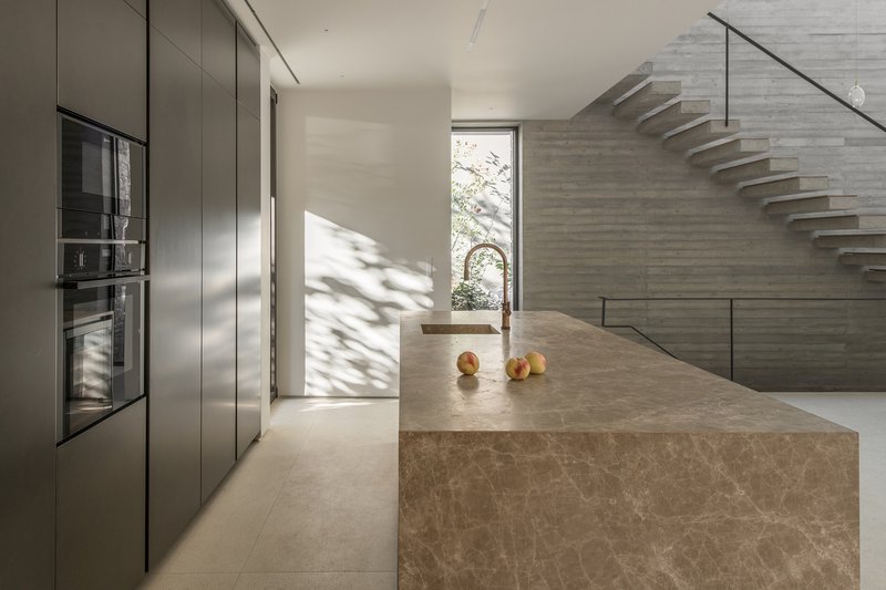 A central atrium acts as a transitional space, connecting the contrasting qualities of the interior spaces with the outdoor environment, reinforcing the cave-like feeling of shelter and openness.