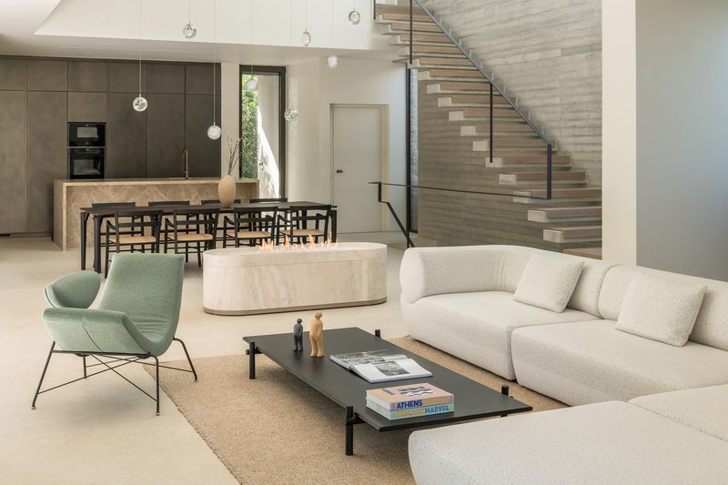 Concrete, with its earthy textures and robustness, plays a crucial role in linking the building to its archetypal inspiration while providing a contemporary edge.