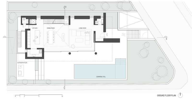 The ground level houses the main living areas, designed to extend seamlessly to the outdoor spaces, encouraging interaction with the natural environment and among the family members across generations.