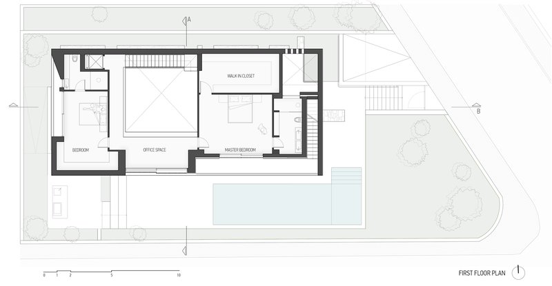 The residence’s orientation along the east-west axis maximizes natural light penetration, creating a dynamic interplay of light and shadow that shifts throughout the day and seasons, enhancing the living experience by continuously transforming the space.