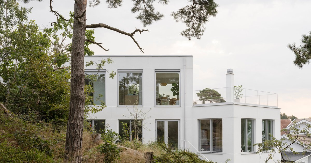 Situated on one of the last undeveloped plots in the neighborhood, Villa Näset is a response to the site's dramatic height variations and irregular shape. The 430-square-meter home is designed as two rotated, interconnected two-story volumes, carefully positioned to harness natural daylight and frame views of the ocean. The angular orientation enhances spatial dynamics while creating a series of terraces and courtyards that integrate the home with its surroundings.