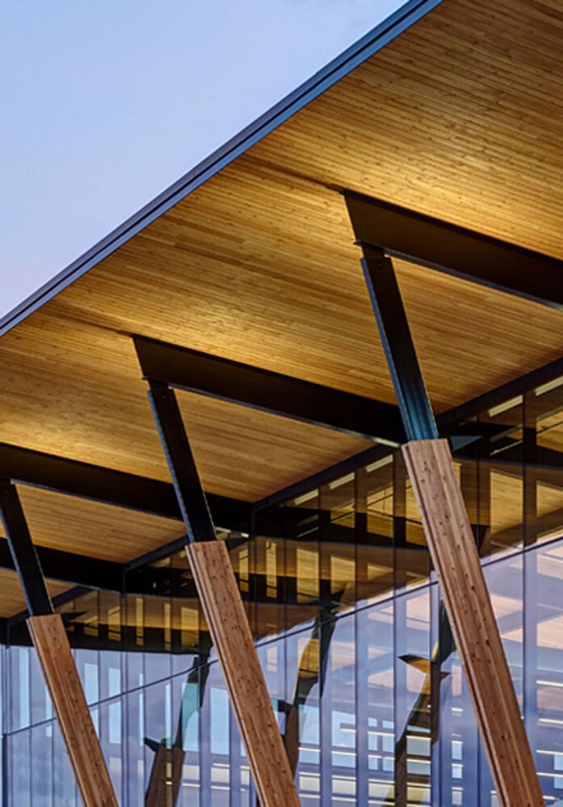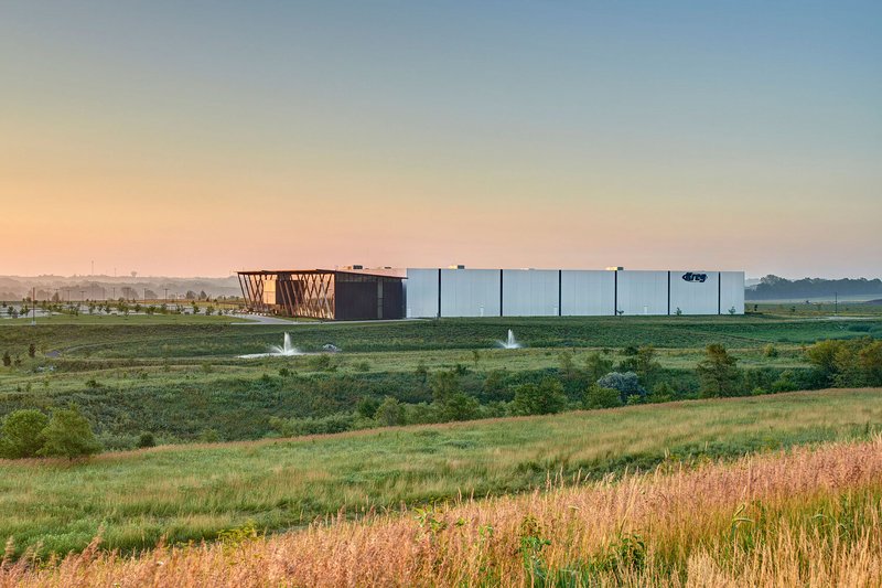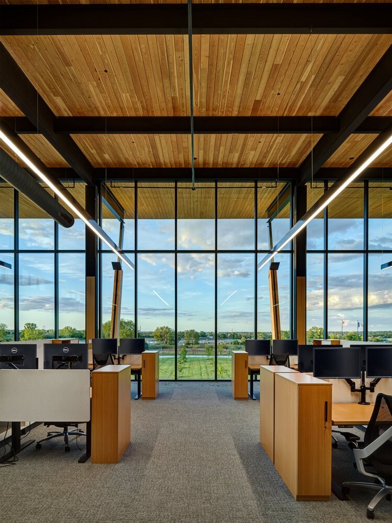 Material choices balance innovation with a grounded pragmatism reflective of Midwestern values. The office is framed in steel with laminated wood decks, while the exterior combines a black metal rainscreen and precast concrete panels to delineate different functions without visual separation.