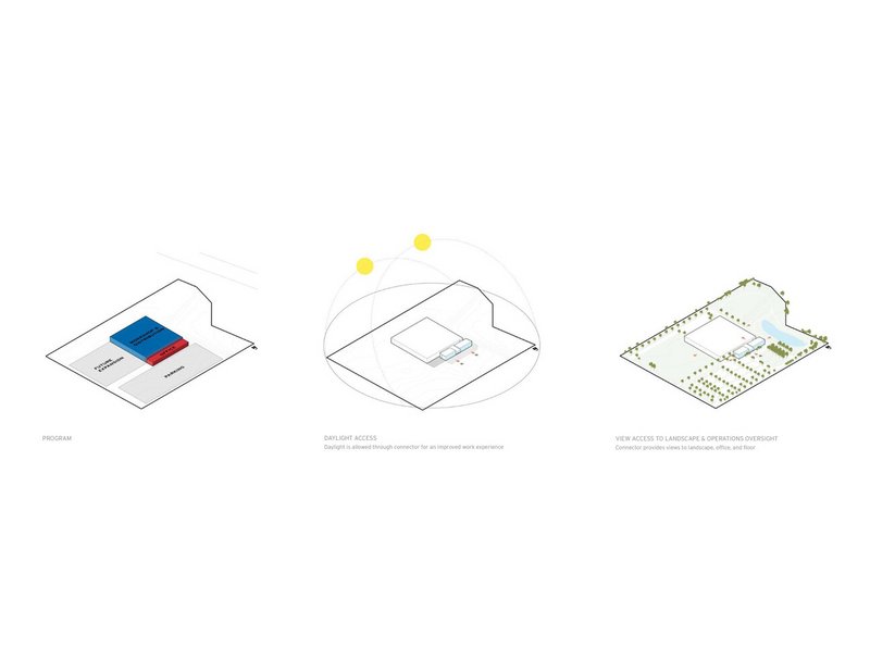 The project strategically unites a 50,000-square-foot office with a 105,000-square-foot manufacturing facility on a sustainably managed 25-acre campus. Designed to accommodate future expansion, the master plan emphasizes modular growth while reinforcing the company's commitment to operational agility. Instead of isolating functions, the architecture blurs distinctions between departments, dissolving traditional silos and creating a unified corporate ecosystem.