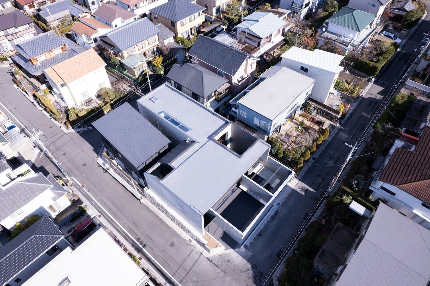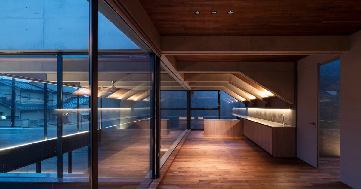 Set on an L-shaped plot that borders two roads, the home takes advantage of its changing topography and dual orientation. The main southern façade features a bold overhang and expansive glazing, framed by a concrete wall finished with cedar-board formwork—offering a tactile reminder of traditional Japanese material craft. The northern façade, defined by a powerful cantilever, forms a pilotis garage that gives the home a grounded yet dynamic presence.