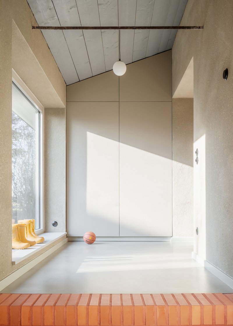A minimalist farmhouse renovation in Germany blends exposed brick, timber, and clay to create a crafted, sustainable rural retreat.