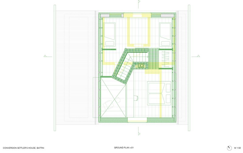 The design also avoids mechanical cooling by employing architectural responses to climate. Perforated, powder-coated steel shutters provide natural ventilation and a sense of connection to the outdoors, enhancing the rural living experience. These elements enable comfortable night cooling during summer without any active systems.