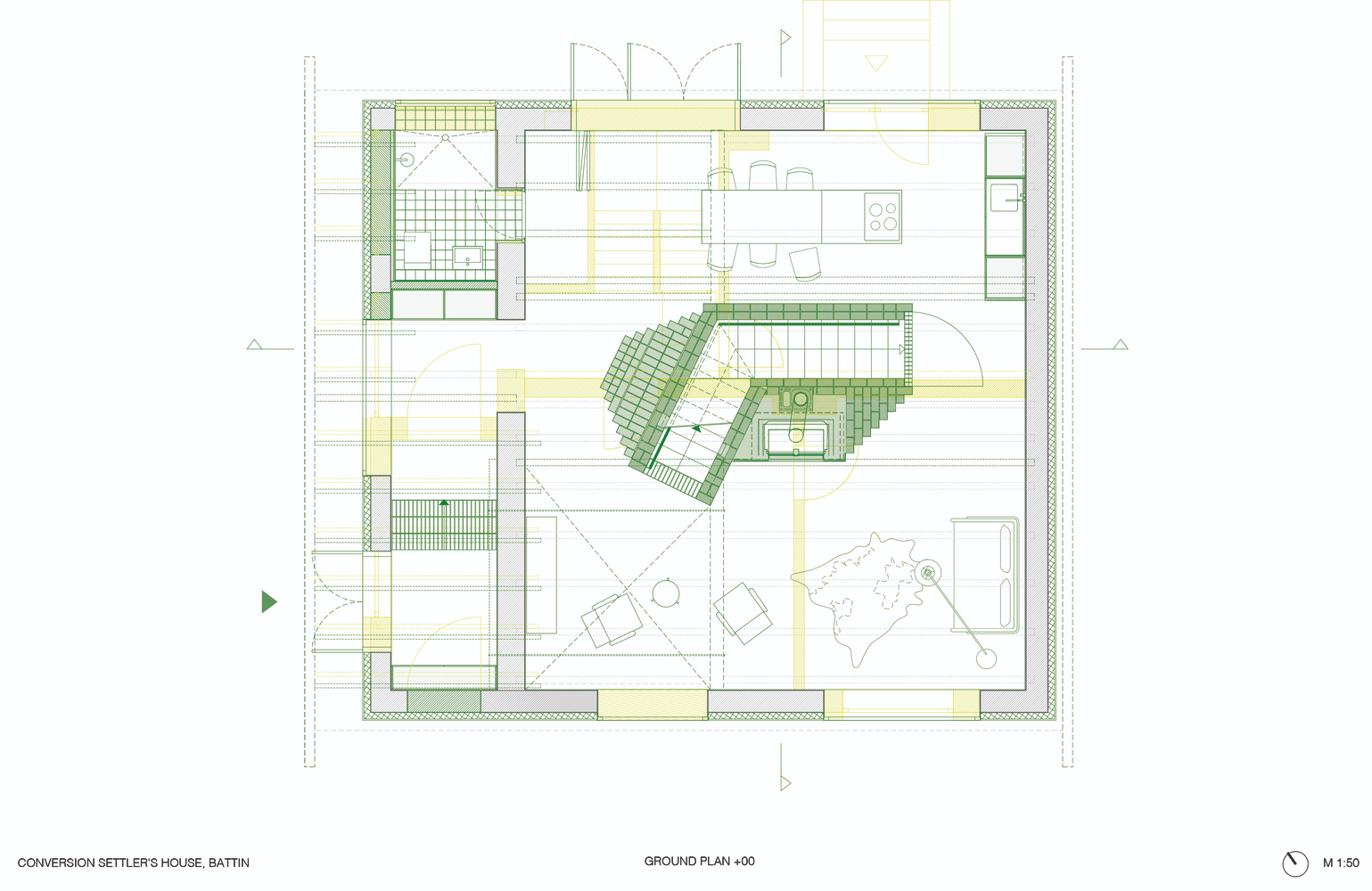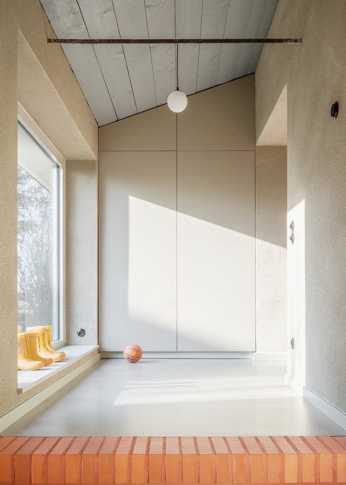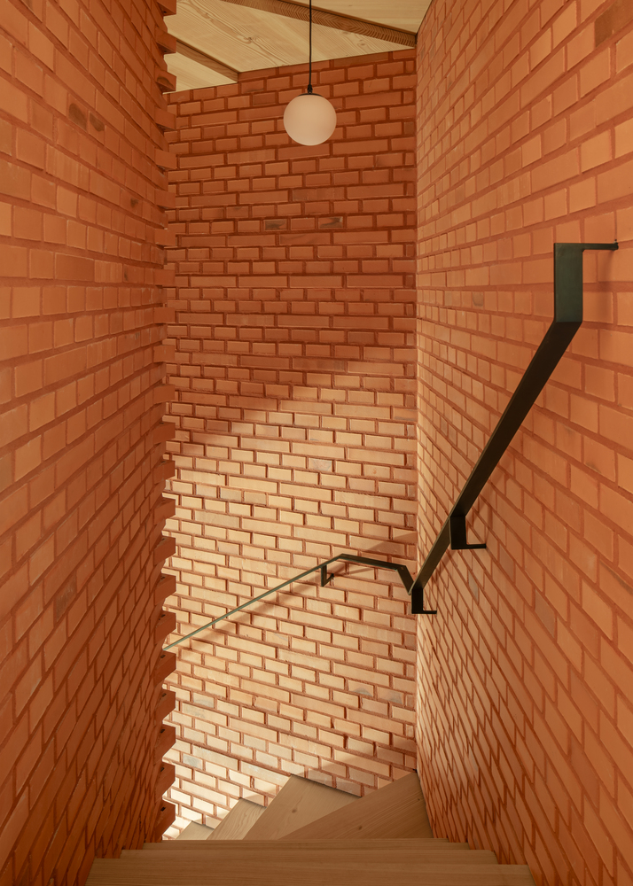 At the center of the renovation lies a sculptural room insert—a commanding brick structure that integrates a staircase and a fireplace. More than a functional element, this insert is the architectural core of the home, guiding circulation and anchoring surrounding living spaces. The brickwork is executed with striking precision, its jointing rhythmically following the slope of the integrated wooden staircase.