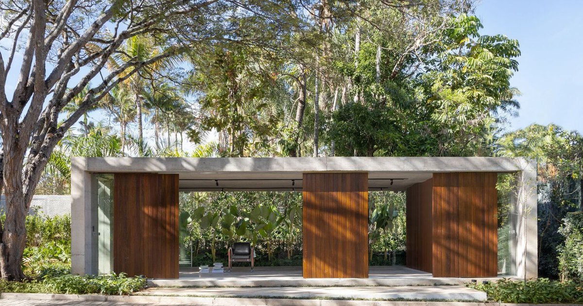 Ipê wood slatted panels further enhance the design’s connection to the main house, offering warmth and texture. Sliding clear glass doors on the side openings create visual permeability, inviting the lush garden vegetation into the interior. These are complemented by sliding brise-soleils that provide dynamic sunlight control and moments of privacy.