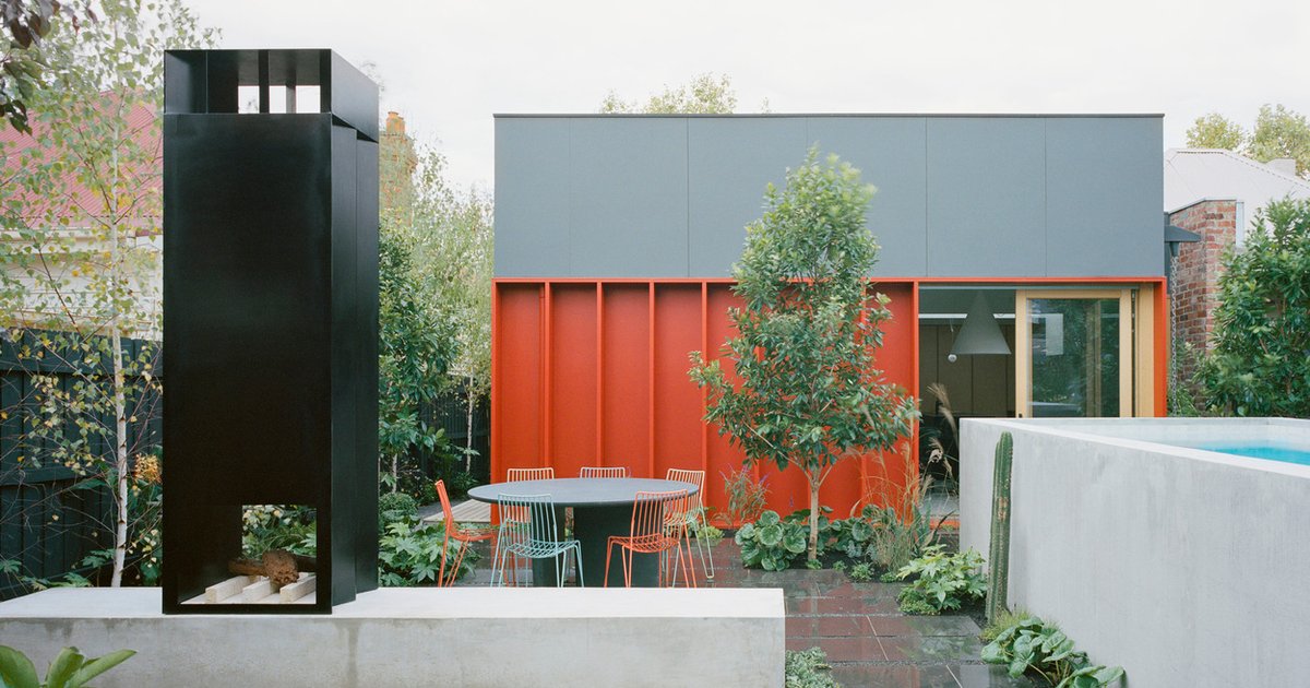 The choice of materials plays a critical role in creating a cohesive and well-defined structure. The existing house uses light-colored materials for the children’s areas, contrasting with the darker tones in the master bedroom and corridor. The extension, by contrast, is brighter and more stripped-back, with a minimalist approach that uses terrazzo flooring, plywood joinery, and sleek black accents. Externally, the new addition features dark cladding complemented by red door reveals and fins that create depth and texture, protecting openings and enhancing the overall aesthetic.