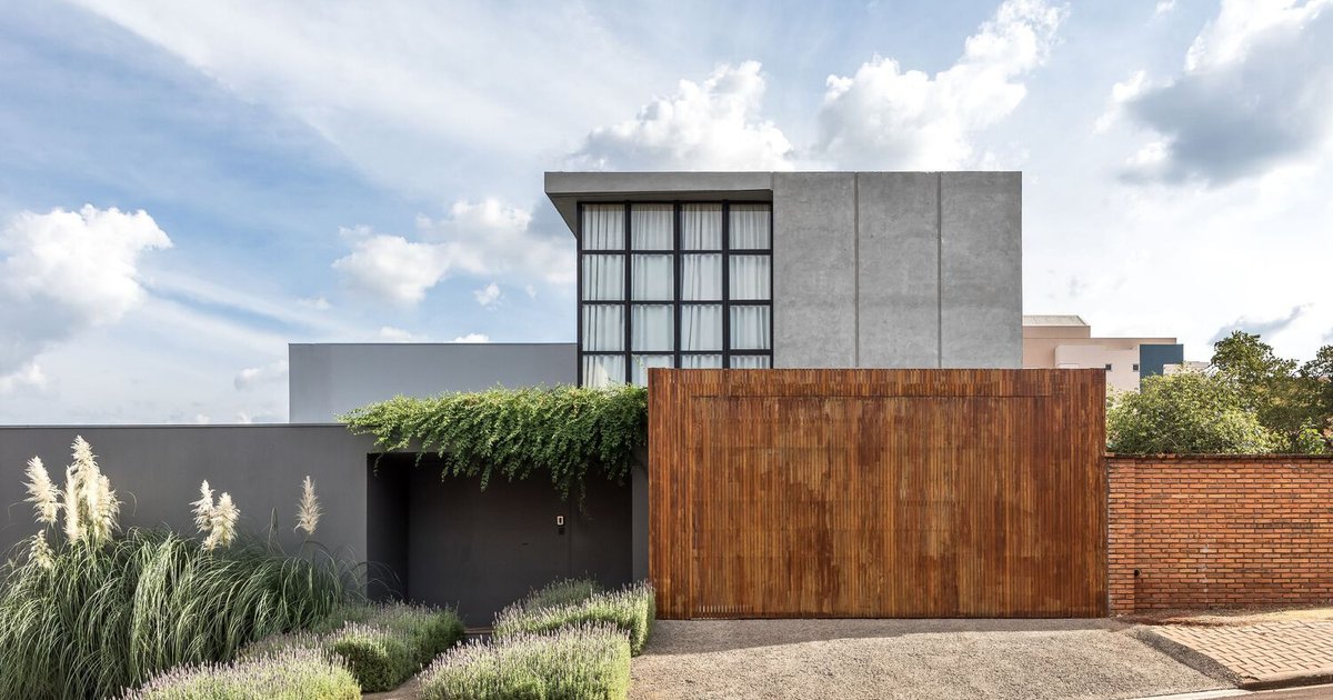 The facade of the house boasts an upper volume that serves dual purposes: housing the family's office and creating an overhang for the main entrance. This innovative use of space is complemented by a wood-clad wall that adds warmth and texture to the home's exterior.
