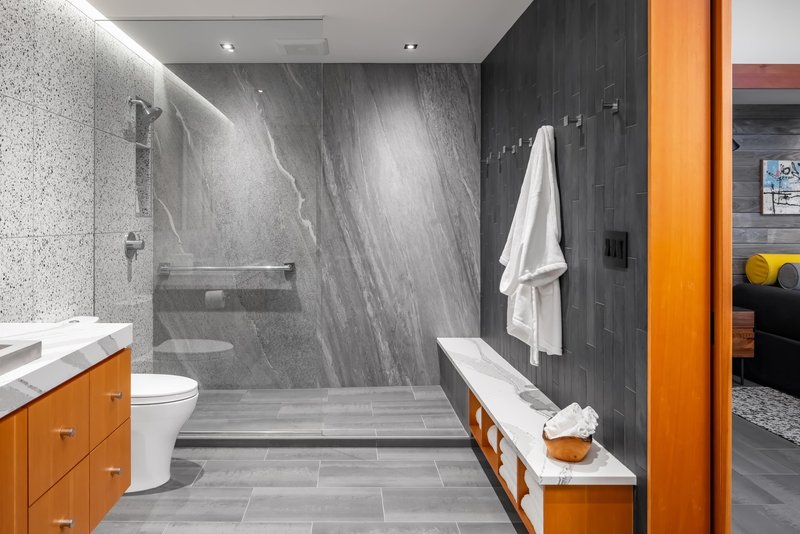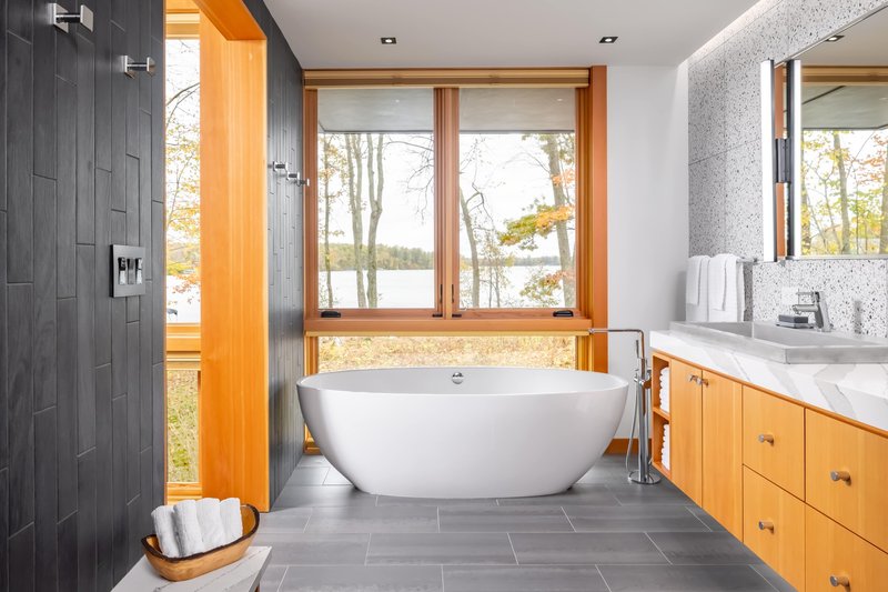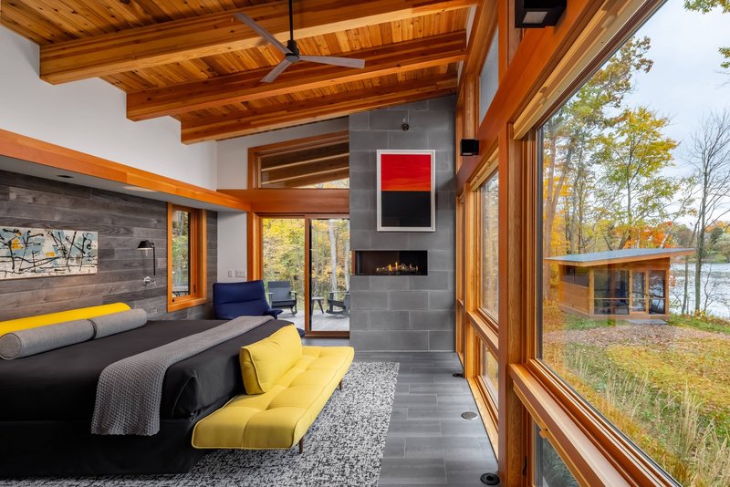 Beyond the interiors, the Red Cedar Lake House offers an exceptional outdoor lifestyle through carefully crafted experiences. A slope of native groundcover leads to a fire pit and a family beach. Corten steel pathways carve subtle transitions toward a boathouse and dock, blending modern materials with natural textures. On the eastern end, the primary bedroom cantilevers over the landscape, providing a private balcony perfect for morning wildlife viewing and peaceful sunrises. Nearby, an outdoor sauna and shower allow residents to fully immerse themselves in lakeside rituals.
