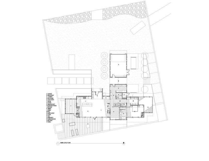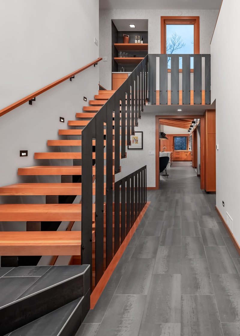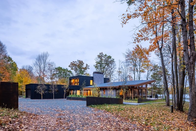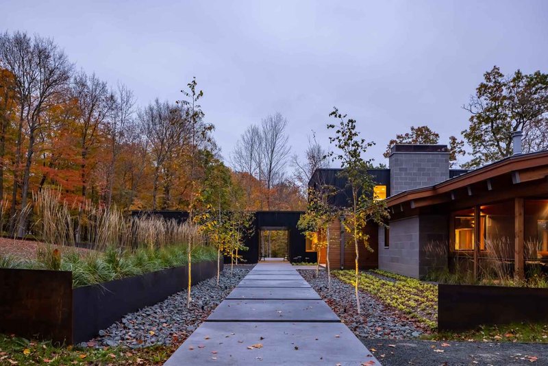 The design responds to the site’s topography and ecology by dividing the land into two distinct zones: a carefully landscaped area around the home and an untouched natural expanse. This thoughtful planning ensures minimal environmental disruption while enhancing the immersive experience of lakeside living. Approaching the home, visitors are greeted by a concealed high point and a trap rock courtyard, offering a sense of mystery and unveiling upon entry. A wooden portal frames the lake views, signaling transition and anticipation. Concrete lily pads scattered across the landscape lead to pathways that connect the home to the water’s edge, including an ADA accessible route, reinforcing inclusivity and thoughtful design.