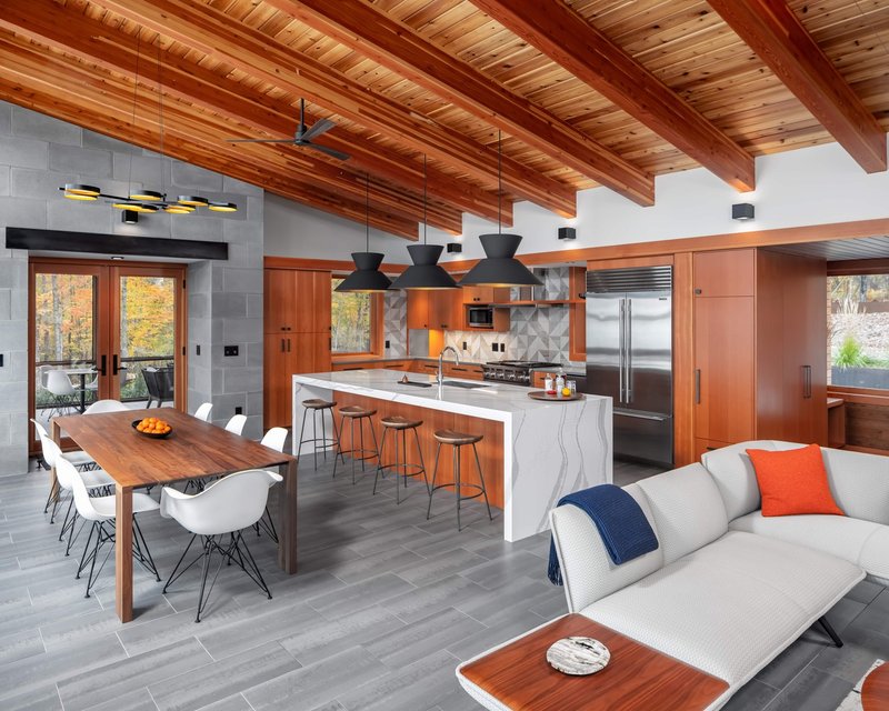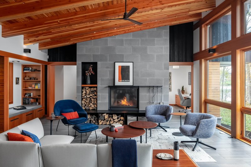 Inside, the architectural language continues with a warm and tactile material palette. Blackened steel and glulam tread stairs guide movement to a guest loft featuring Douglas Fir bunks, cork flooring, and Birchbark wallcoverings—infusing the home with regional character and sensory depth. The main living spaces extend westward along the home's central spine, revealing an expansive patio and screened porch ideal for year-round lake views. A custom fireplace, framed in blackened steel, anchors the social spaces, while large double swinging doors and a pass-through window connect the kitchen and dining area to an outdoor bar.