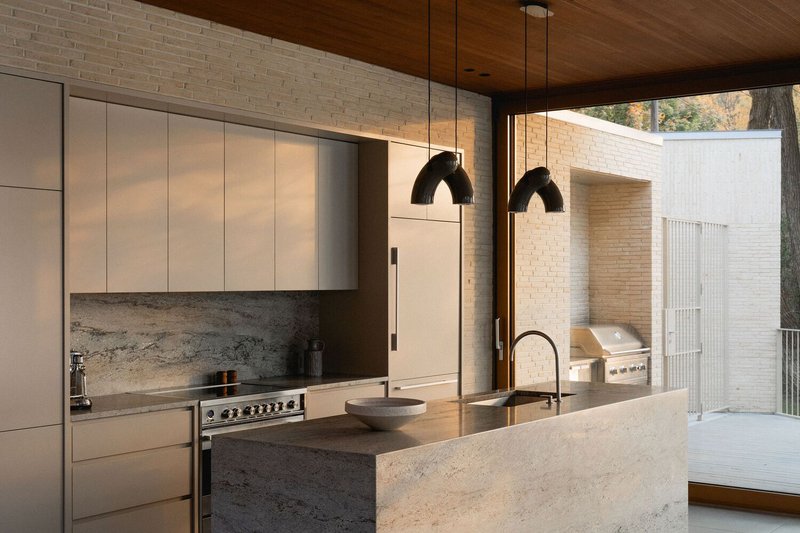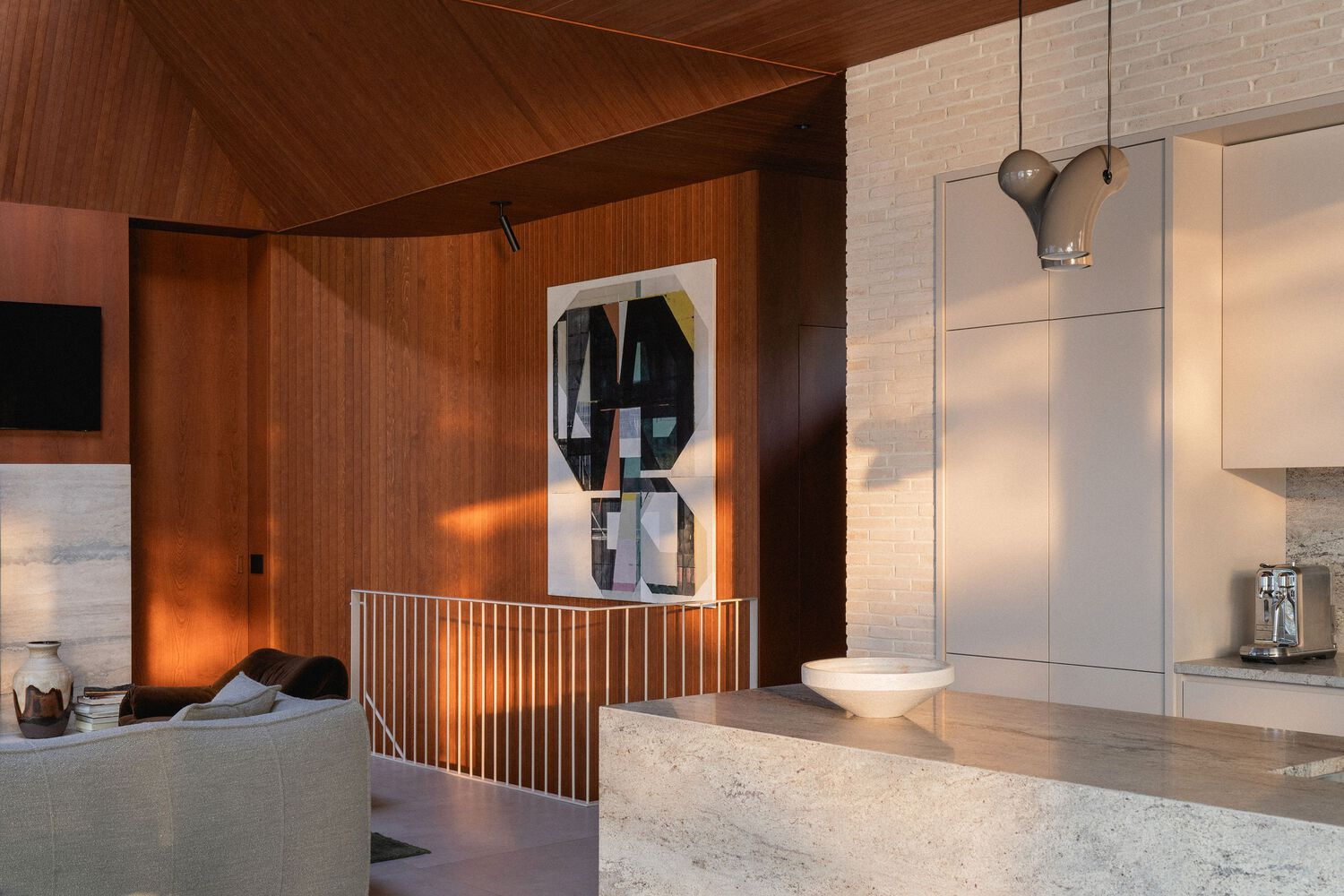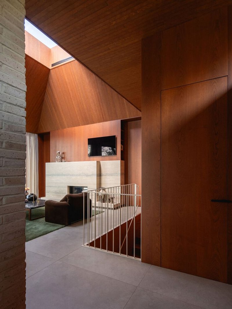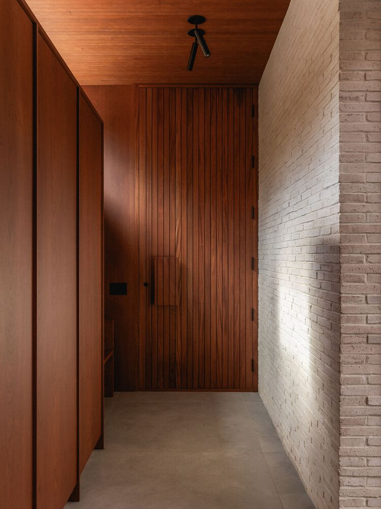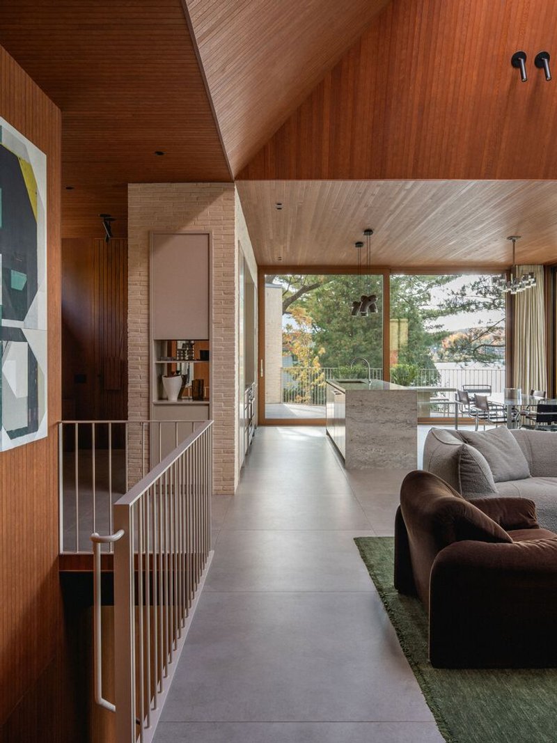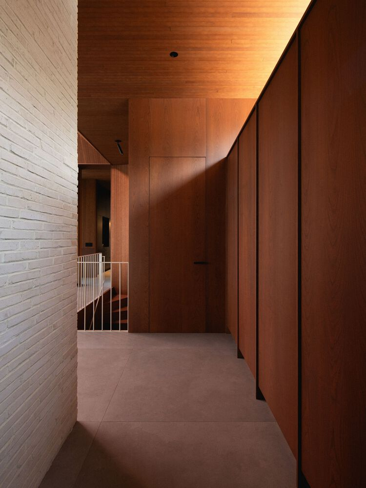 Departing from the dominant trend of all-white contemporary interiors, the clients sought a richer and more tactile material palette. The ceilings are clad in stained wood paneling, while cherry veneer walls add warmth and depth. Copper-framed windows complement the wooden tones, creating a harmonious interplay of materials. The kitchen wall features beige brick, extending the exterior language into the interior, while a taupe-toned recessed cabinet niche adds subtle contrast.