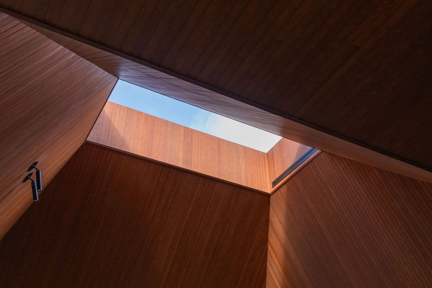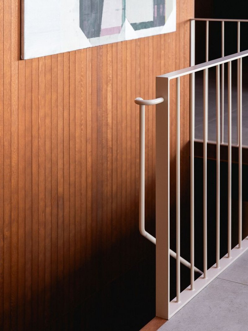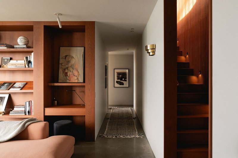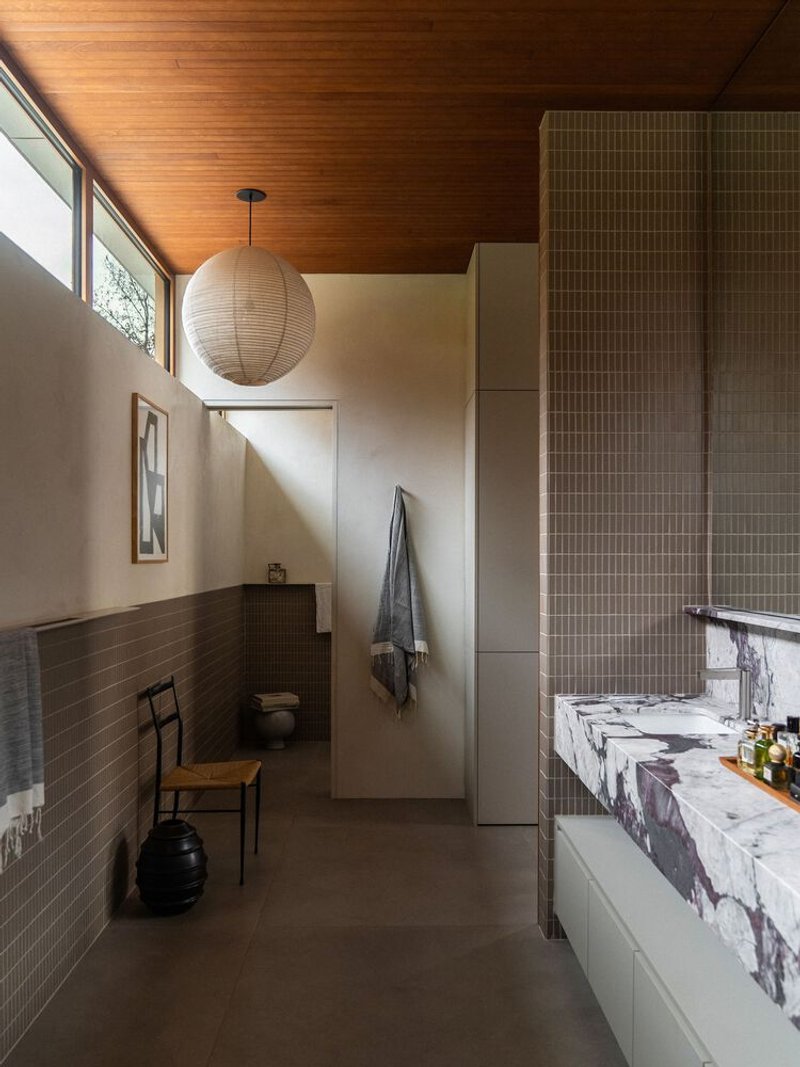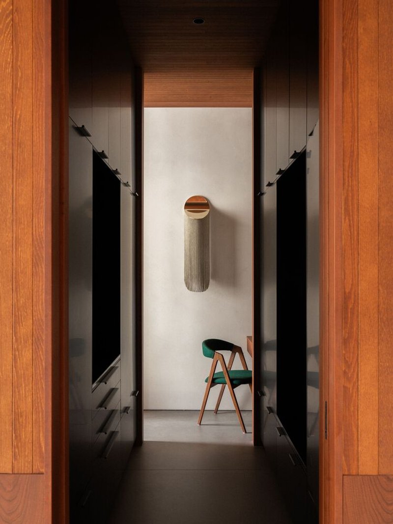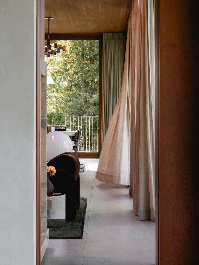 Departing from the dominant trend of all-white contemporary interiors, the clients sought a richer and more tactile material palette. The ceilings are clad in stained wood paneling, while cherry veneer walls add warmth and depth. Copper-framed windows complement the wooden tones, creating a harmonious interplay of materials. The kitchen wall features beige brick, extending the exterior language into the interior, while a taupe-toned recessed cabinet niche adds subtle contrast.