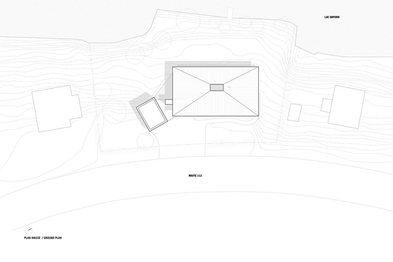 To the east, the master bedroom shares a two-sided fireplace with the living area, creating a warm and intimate ambiance. Due to its proximity to a neighboring property, glazing is kept to a minimum, but a carefully positioned corner window allows for morning sunlight and picturesque views of Mount Orford.
