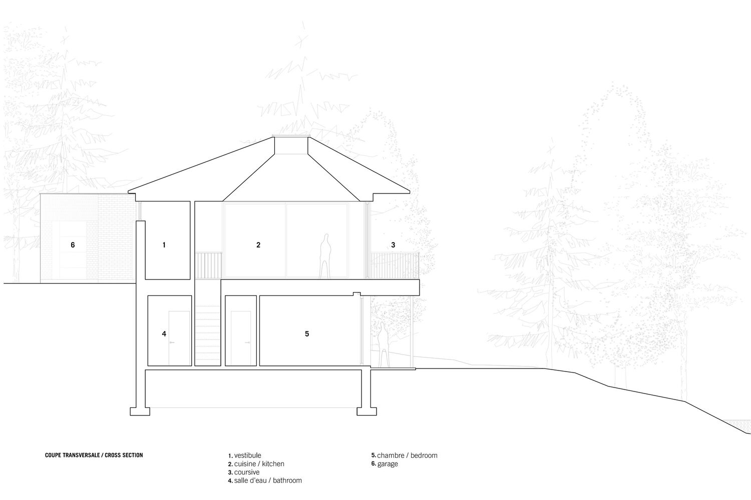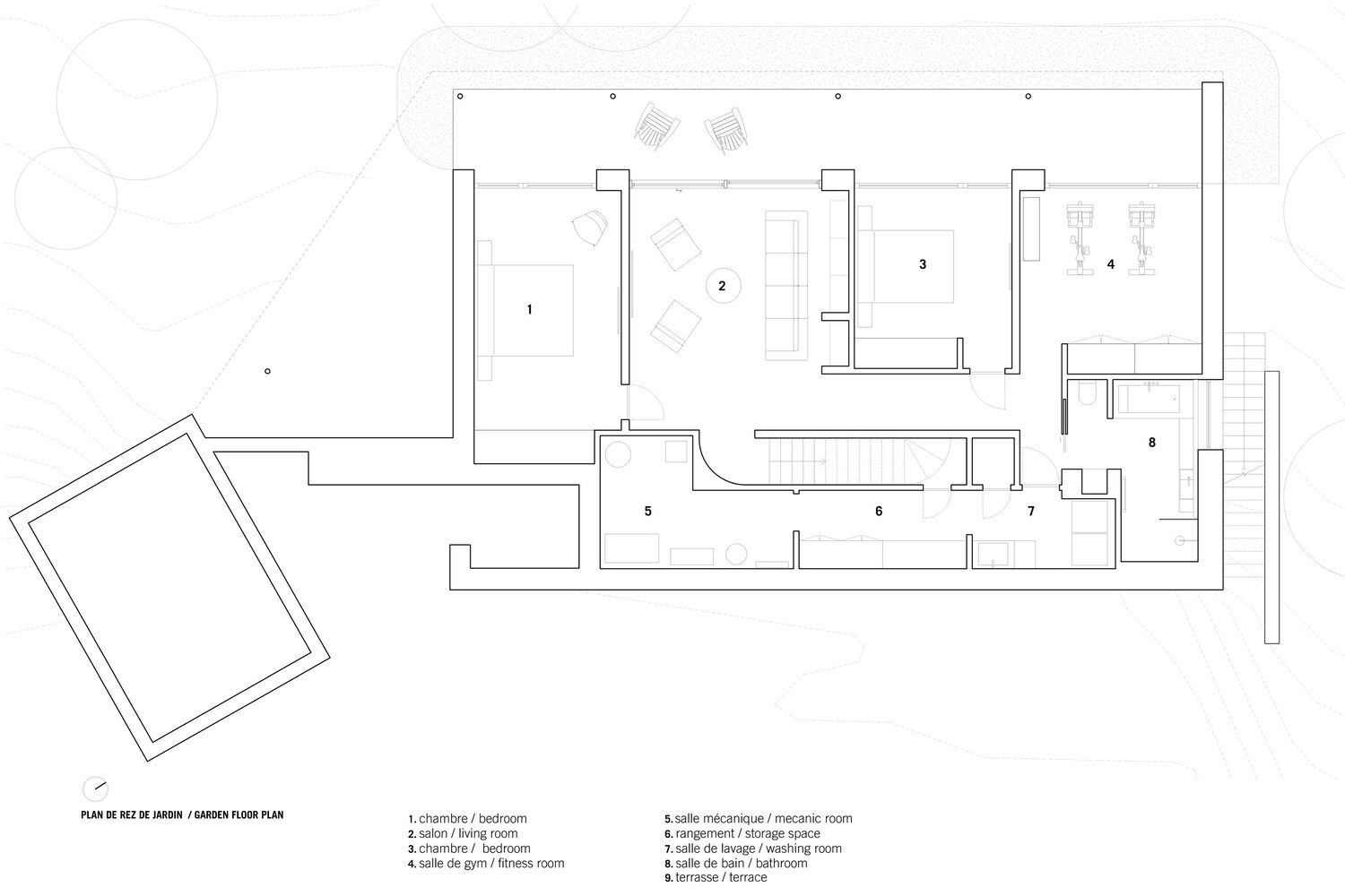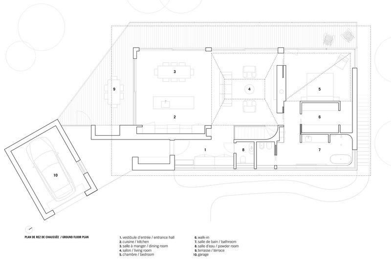 The interior layout follows a split-level arrangement, with the main living areas positioned at street level and the private quarters, including guest bedrooms and a secondary lounge, situated on the lower garden level. This zoning strategy ensures that communal spaces remain light-filled and expansive, while the more intimate areas enjoy a secluded and cozy atmosphere.