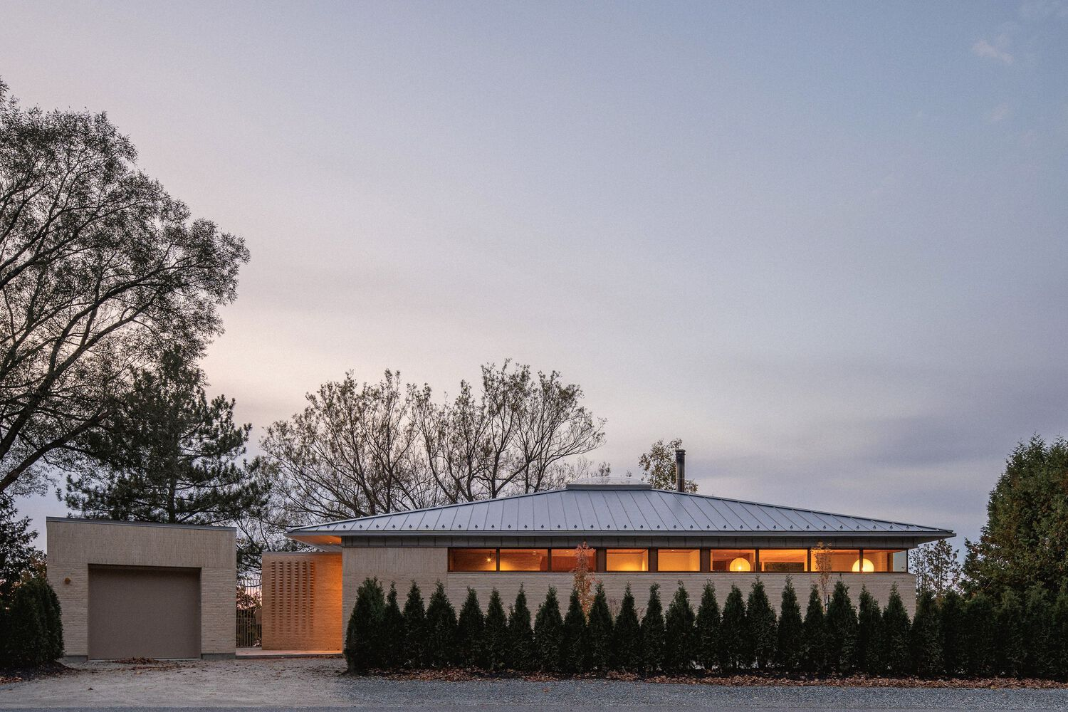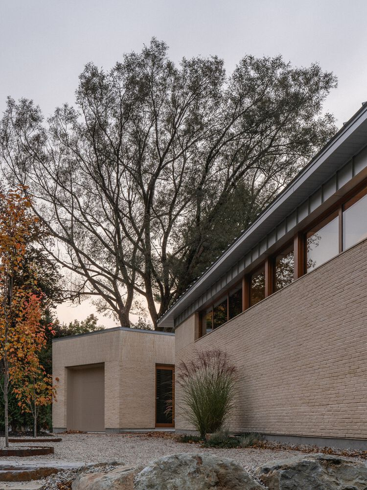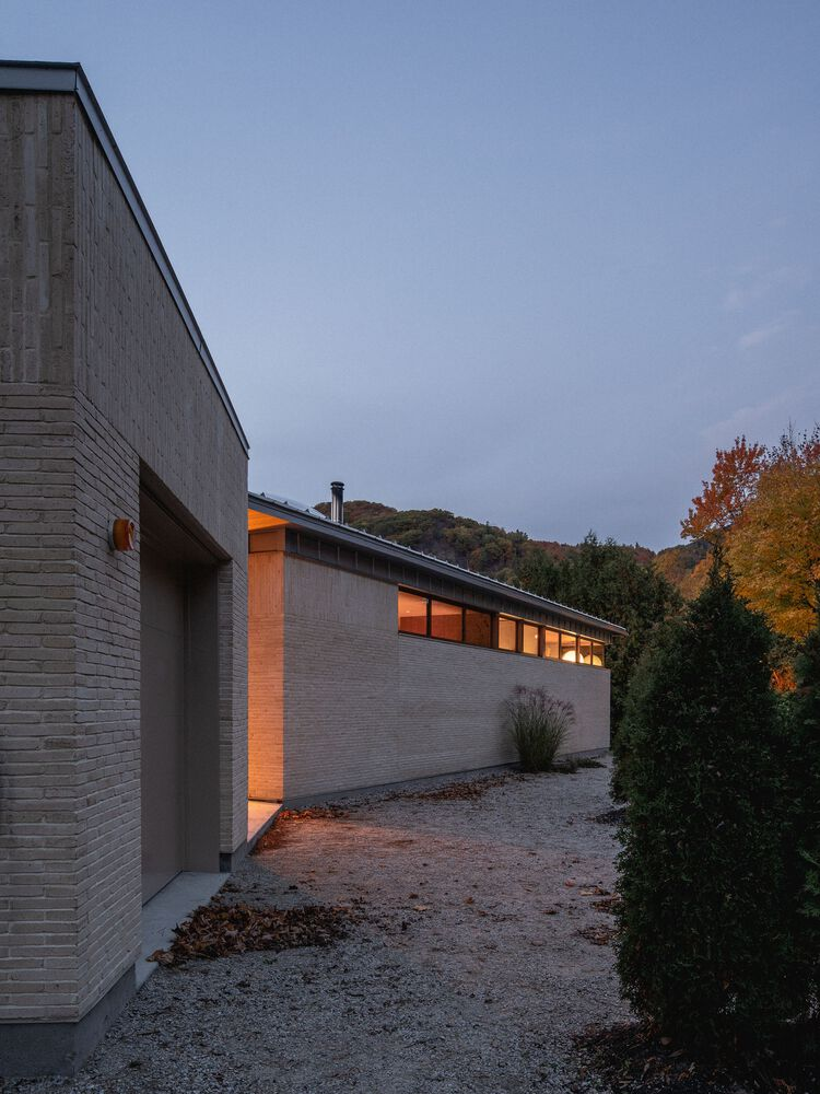 The architectural form of Palissade Cottage is defined by a monolithic masonry structure topped with a low-pitched four-sided roof. A detached garage, clad in matching masonry, echoes the design language of the main residence. The choice of brick as the primary exterior material enhances both durability and acoustic insulation from the busy road. Visually, the heaviness of the masonry base gives the impression that the roof is floating, a subtle architectural illusion achieved by the horizontal window band that separates the two elements.
