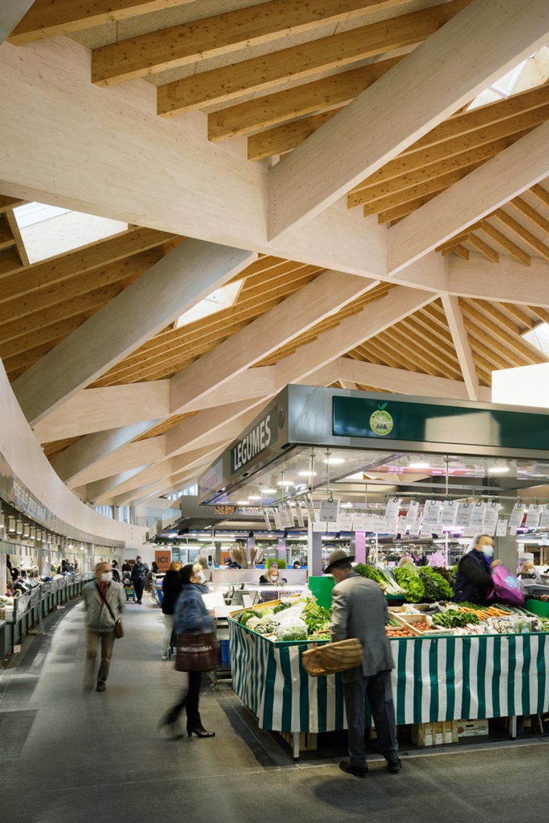 The timber structure adds warmth to the interior, contrasting with the industrial feel of the metal market stalls. Glass facades introduce natural light into the space, enhancing visibility and fostering a transparent relationship between the market and the surrounding public areas. The pitched roof, punctuated by skylights, contributes to the bright and airy atmosphere within the hall.