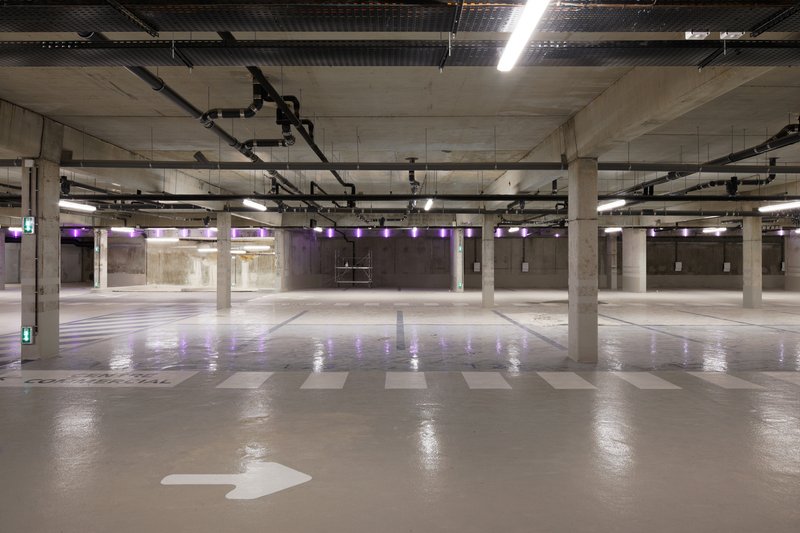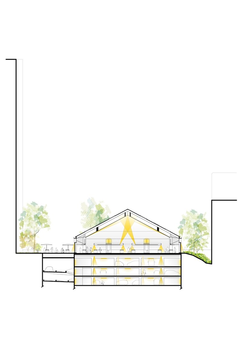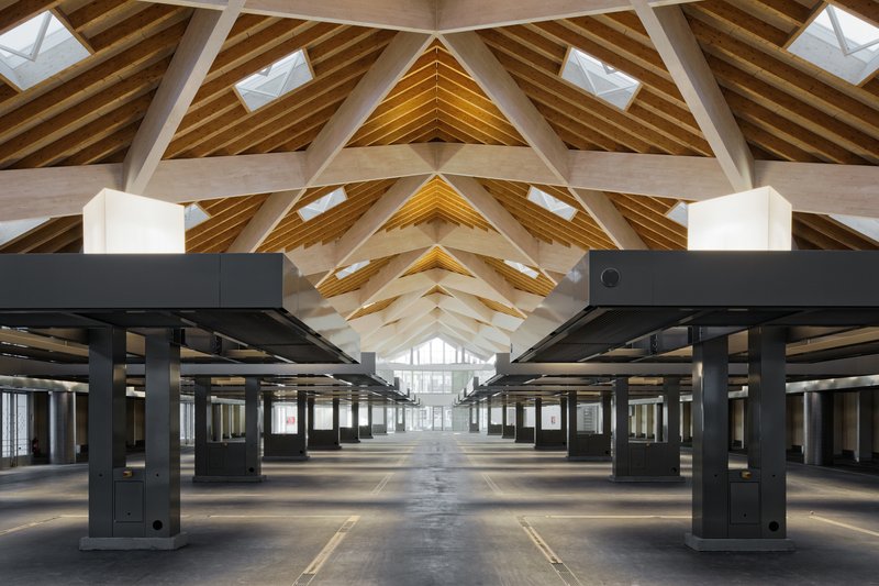 Beneath the market hall, a 600-space underground car park extends over three levels, providing essential infrastructure for the area’s high-density development. The design process navigated complex technical challenges, including co-ownership boundaries, existing utility networks, and an active urban heating system. Despite these constraints, the parking facility achieves optimal functionality and clarity, supporting both the market and the surrounding commercial activities.