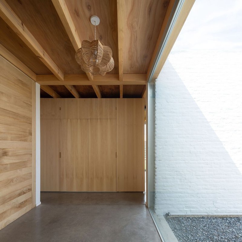 The interior of the house reflects the minimalist ethos through: