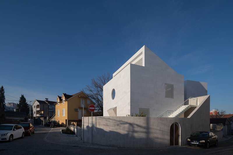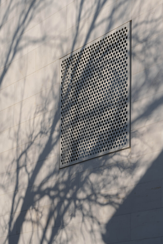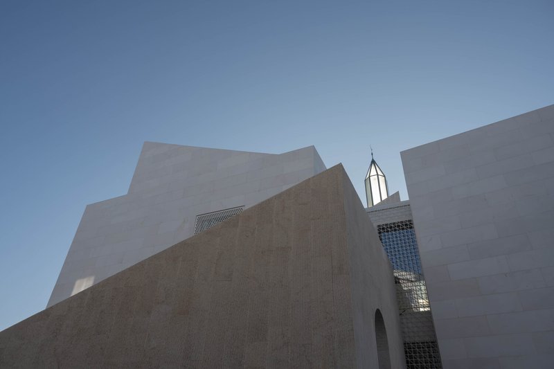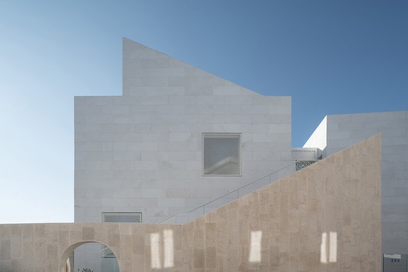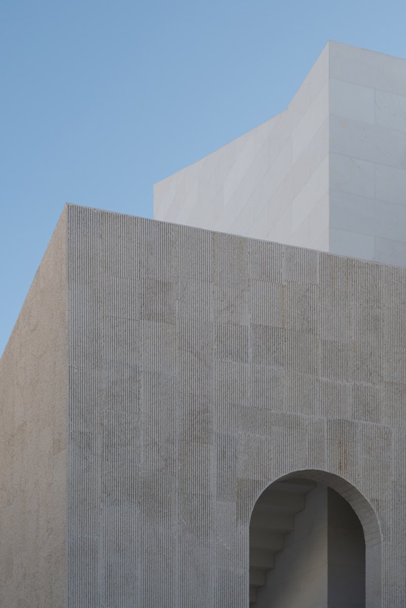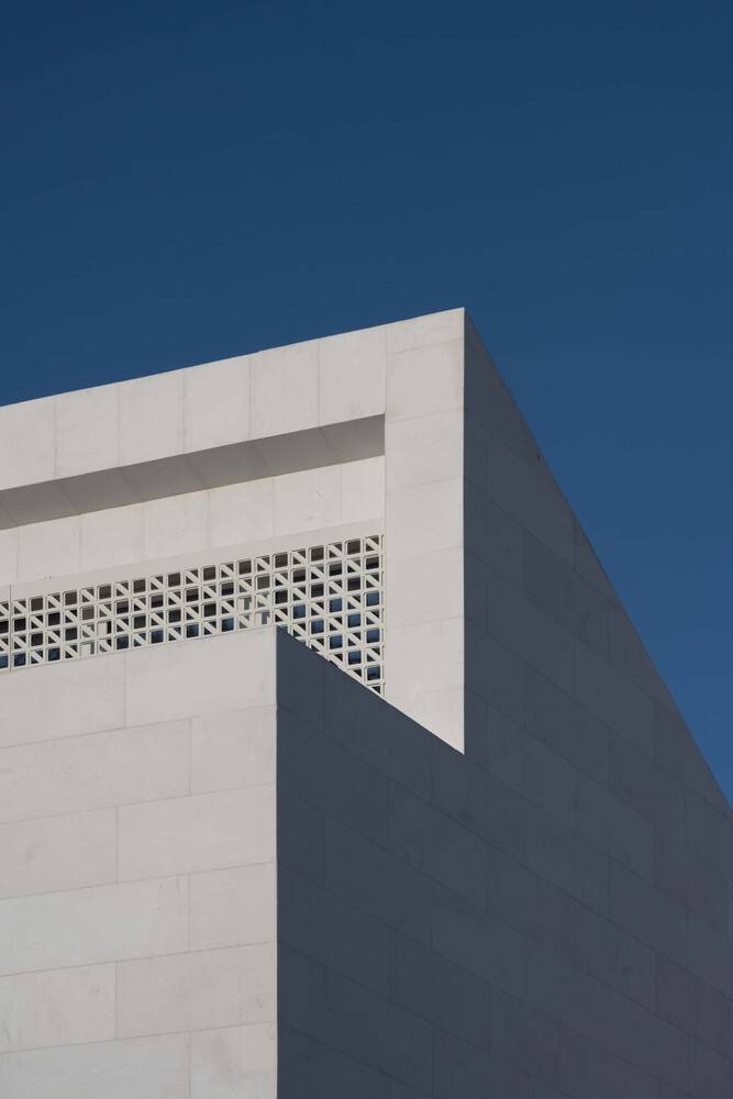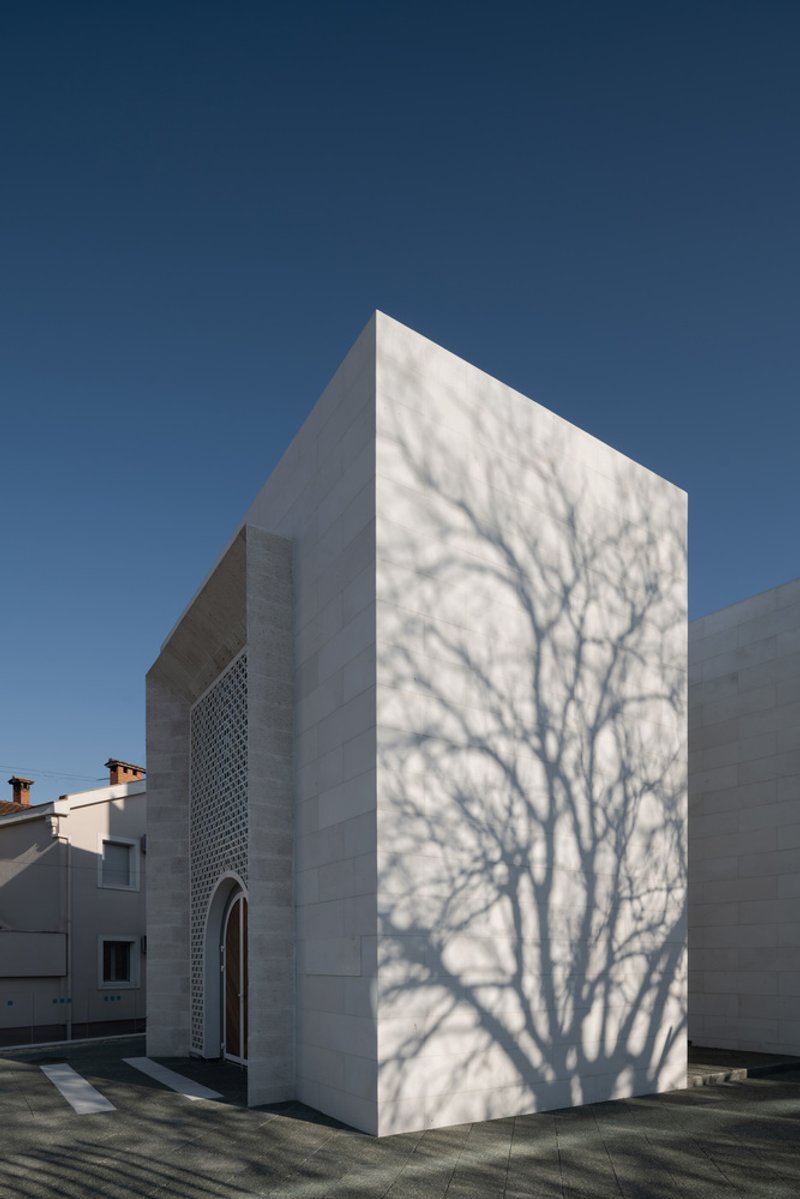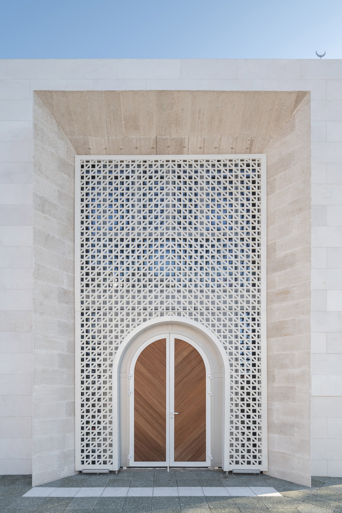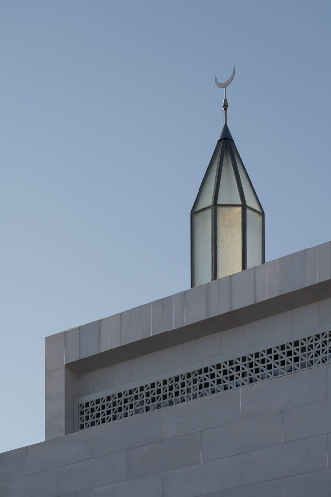 Material selection plays a crucial role in reinforcing the mosque's relationship with its context. In Drač, stone is a traditional building material, and the architects chose to reinterpret this heritage through a modern lens. The mosque’s exterior features brushed stone cladding on the fence and minaret, lending a tactile quality to the surfaces. This textured stone contrasts with the smooth white marble covering the main prayer hall, emphasizing purity and serenity.