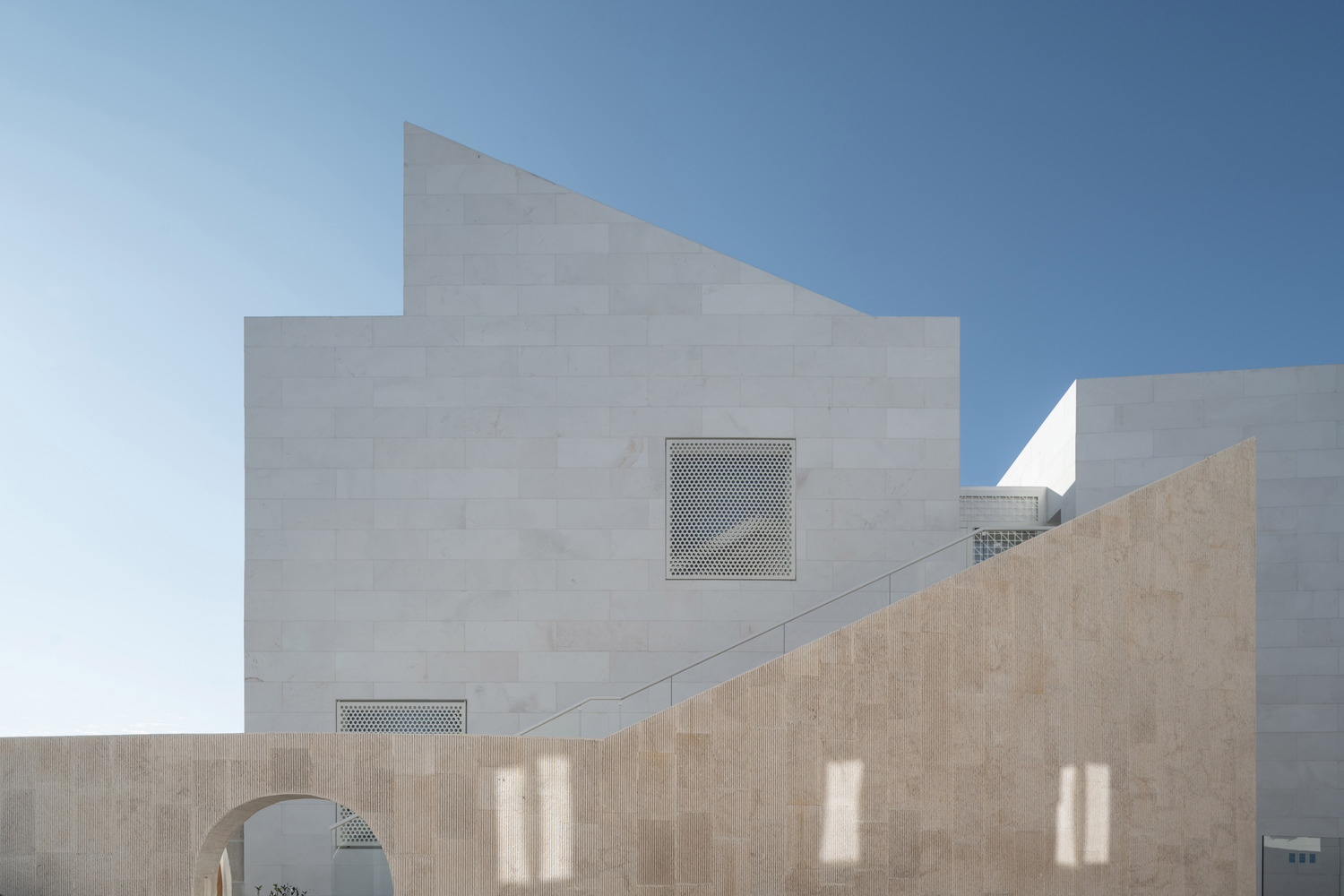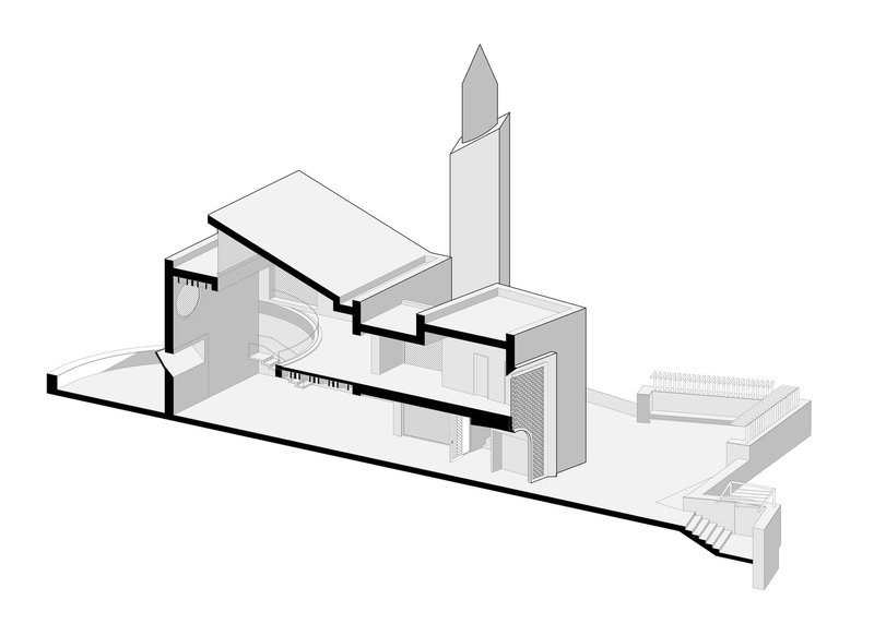 The mosque's minaret echoes the sloping lines of the courtyard wall, creating a dynamic play of ascending and descending masses. This visual movement brings vitality to the structure while preserving the mosque’s spiritual symbolism. Modern mosque architecture often seeks such harmony—balancing minimalism with expressive geometry.