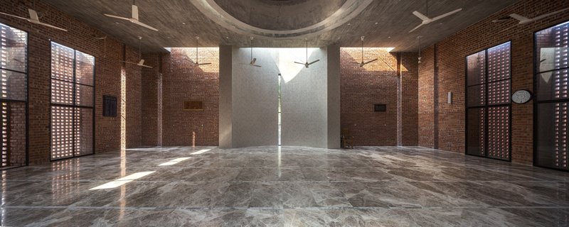 The mosque's design focuses on creating a sacred yet intimate space that caters to the community's needs. The use of local materials, such as red brick, and the emphasis on natural light and ventilation, highlight the mosque's human-centric approach.
