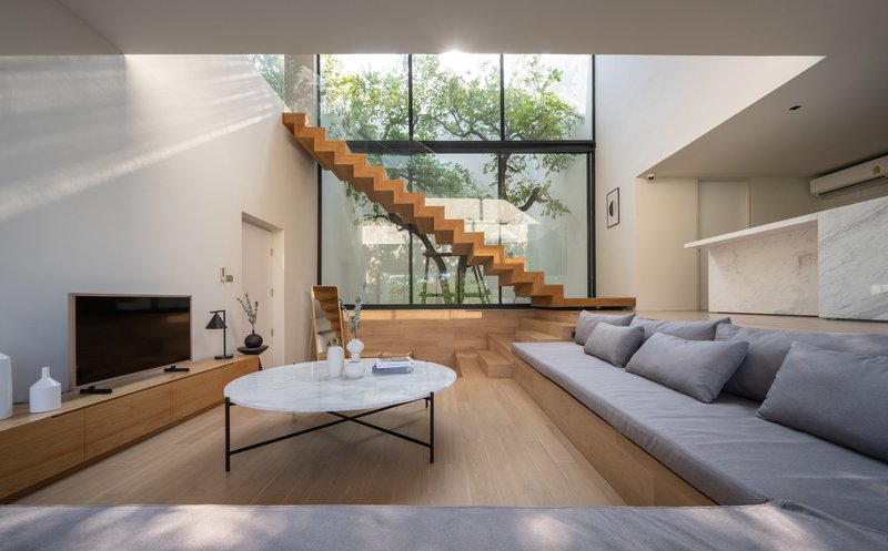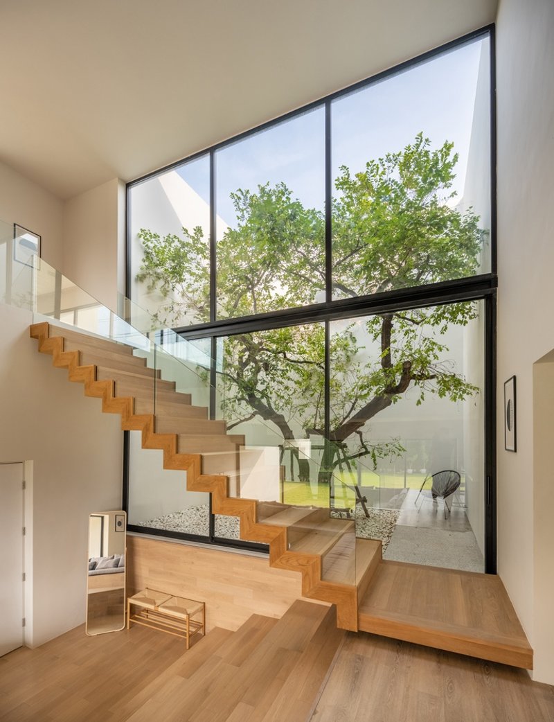 The stairway across the vertical tree court not only serves as a functional pathway but also acts as a striking visual centerpiece. It connects the home’s different levels, creating a sense of unity while enhancing airflow and natural light. The integration of concealed doors in the parents' section exemplifies the architects’ focus on blending privacy with aesthetic appeal. These design elements underscore WARchitect’s commitment to combining elegance with functionality.