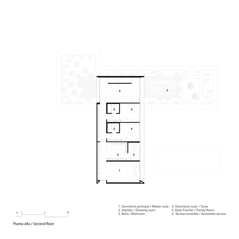 Ascending to the second floor, one finds the private quarters, where en-suite bedrooms and a family room offer sanctuaries of comfort. The master suite, in particular, boasts a spacious dressing room and access to a terrace that offers breathtaking views of Santa Cruz de la Sierra, further blending the indoors with the natural world.