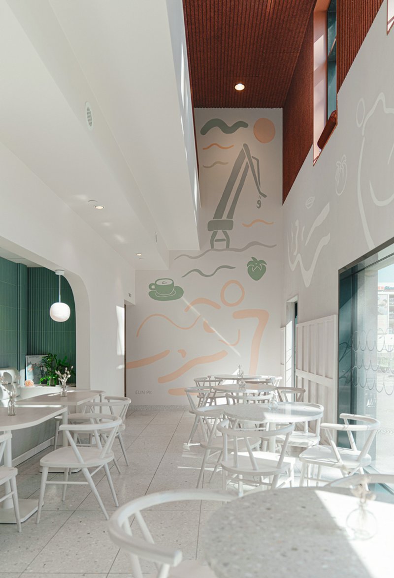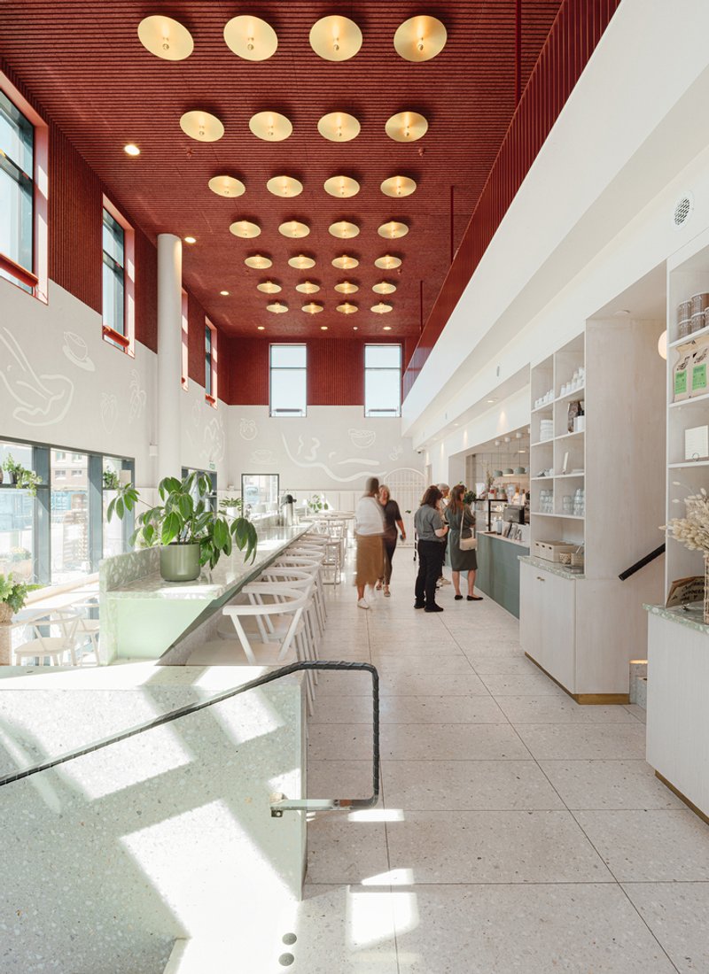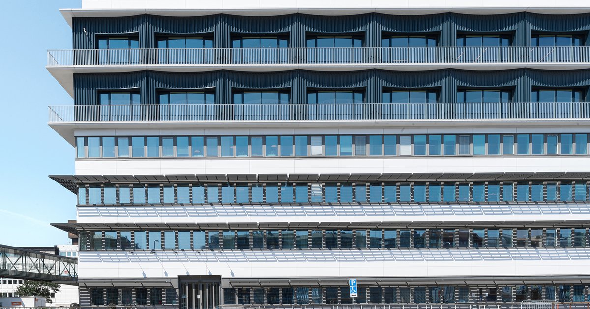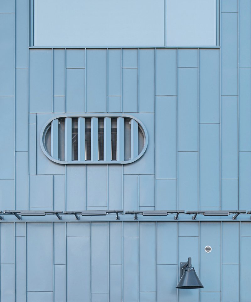 In contrast to the cool tones of the exterior, the lower floors of the building provide a welcoming and warm atmosphere. The entrance lobby houses a café open to the public, creating a sense of community and inviting everyone to experience the space. The red roof of the café is a nod to the industrial past of the port area, where rusty cranes and tin roofs were once common sights. This thoughtful use of color not only reflects the history of the site but also brings a lively and celebratory atmosphere to the building’s design.