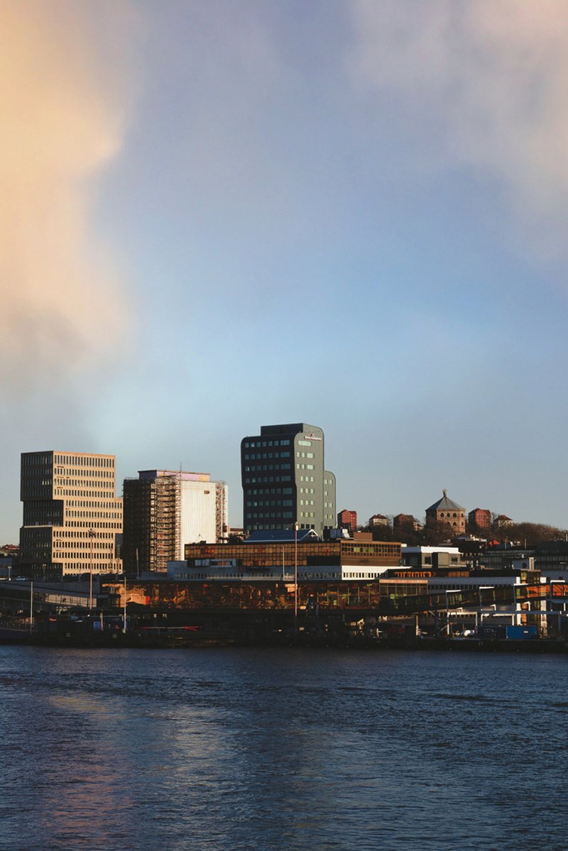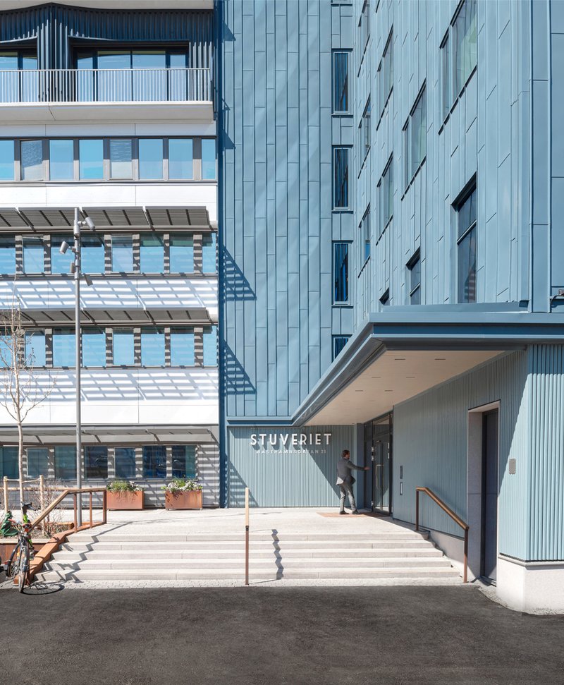 The Stuveriet Office Building stands tall in Gothenburg's Masthuggskajen district, a vibrant area that blends the old and new aspects of Swedish urban life. Designed by Erdegard Arkitekter, this office building boasts a distinctive silhouette that rises 16 stories in the air, clad in thunder blue sheet metal. Its design embraces irregularities, with many corners and edges that curve upward, creating a dynamic and fluid shape that is both modern and functional.