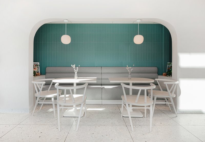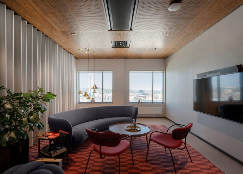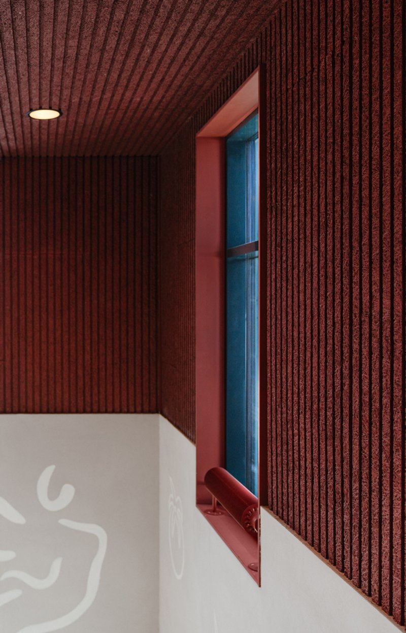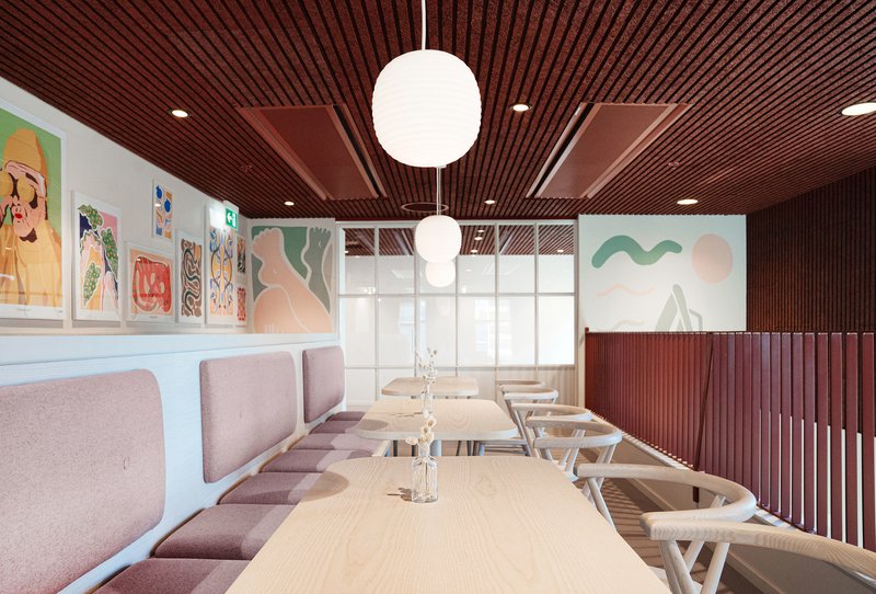 The ground floor of the building is dedicated to creating an open, public environment. The café, with its red roof and cozy ambiance, is designed to be a gathering place for both tenants and the public, fostering interaction and a sense of belonging. The use of wood fiber panels in the ceiling and walls provides an acoustic advantage, making the space feel warm and inviting while reducing noise levels.