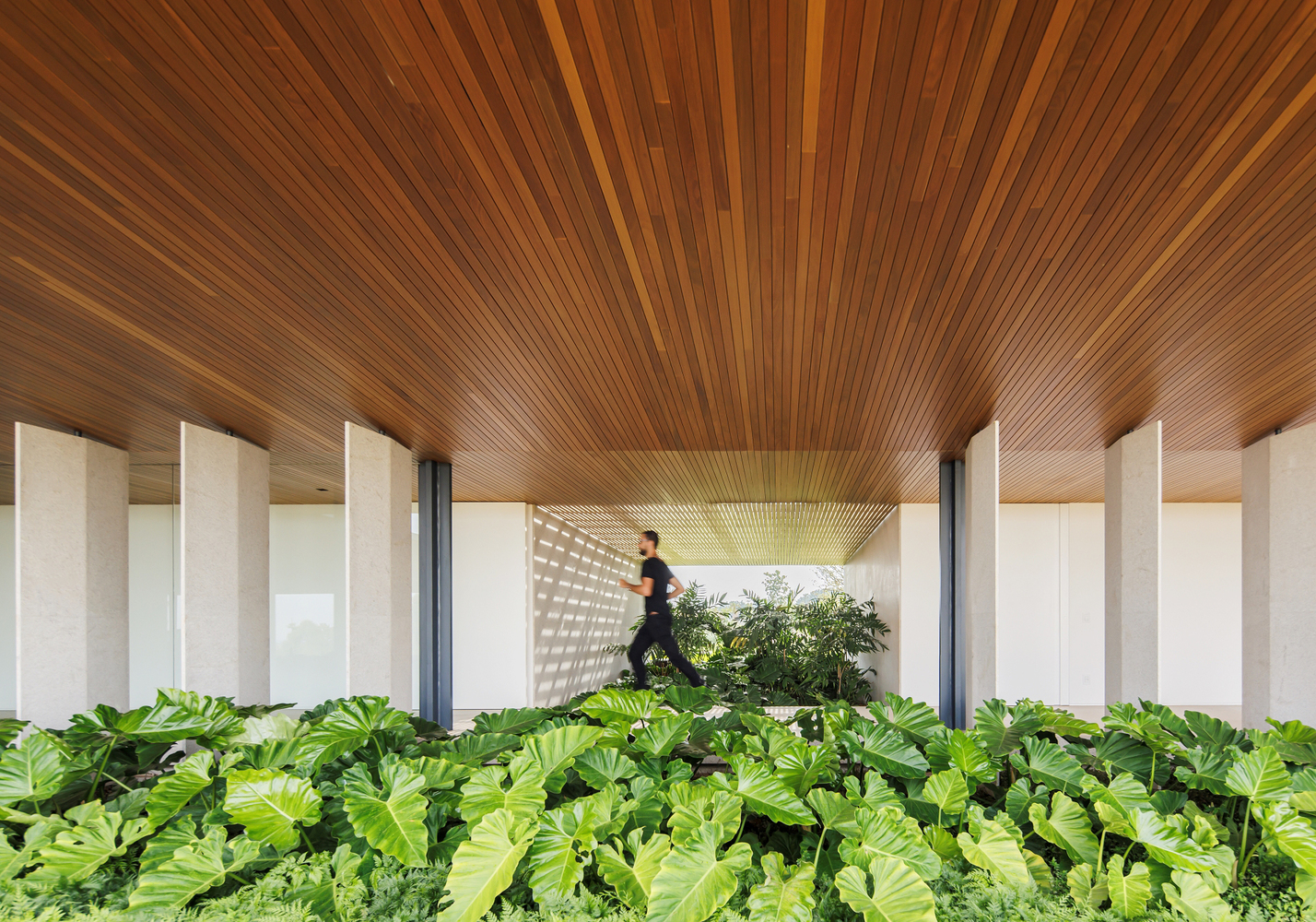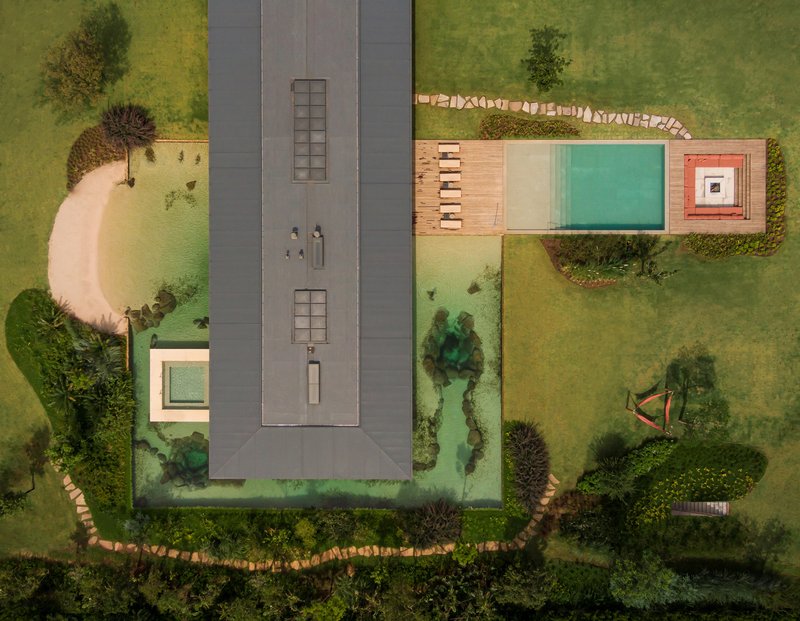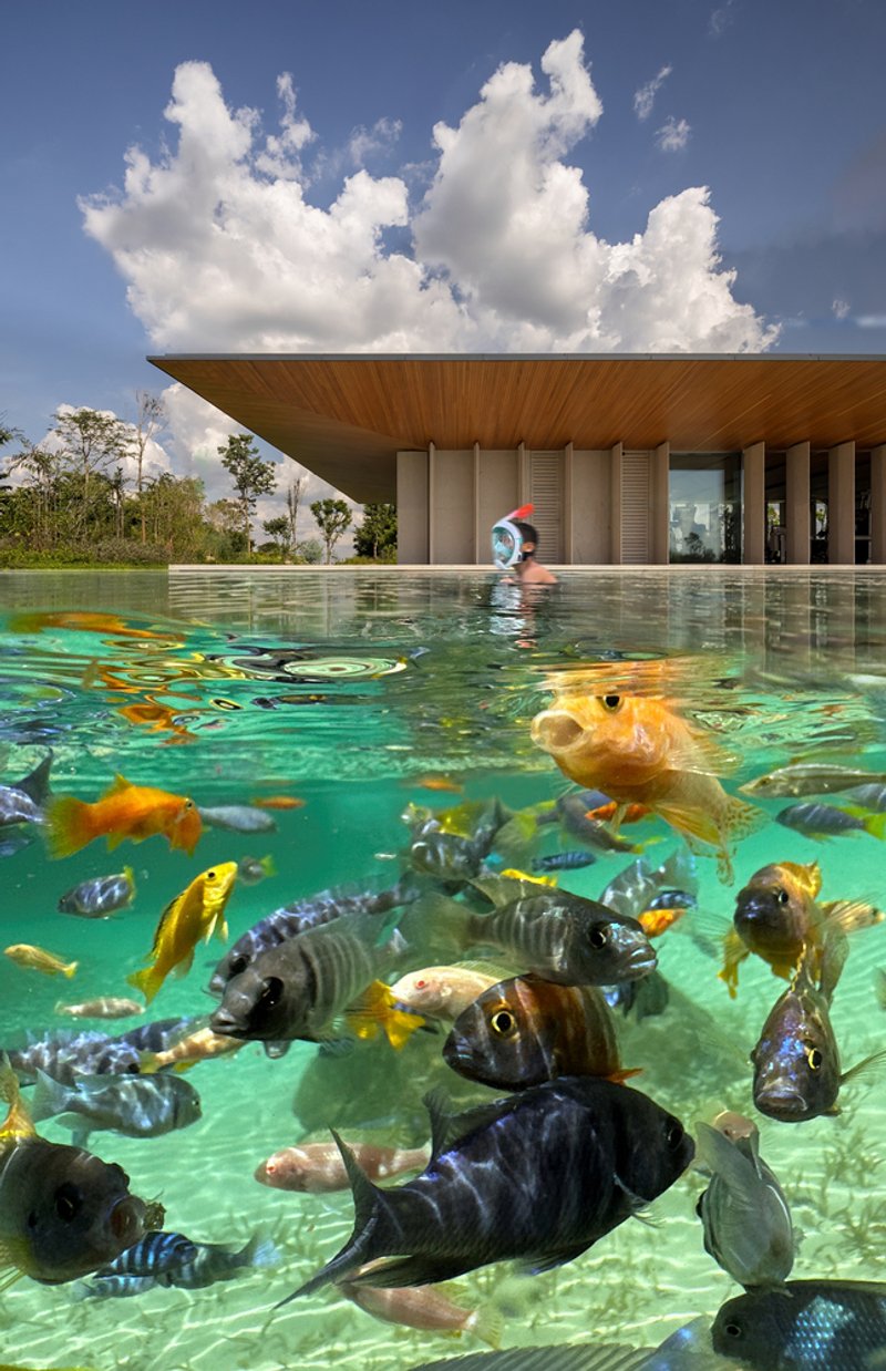 In collaboration with Rodrigo Oliveira, the landscaping incorporates features like a natural pond with aquatic plants and over 6,000 cichlid fish, contributing to ecological balance and a serene atmosphere.